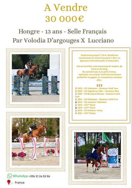 Hongre de 13 ans, expérience jusqu’à 135. Nombreux classements et victoires jusqu’à 130 en épreuves nationales et internationales. Cheval sensible, avec du sang et beaucoup de respect. Destiné à un cavalier confirmé souhaitant évoluer et performer en Amateur Élite. Vidéos et renseignements en message privé.