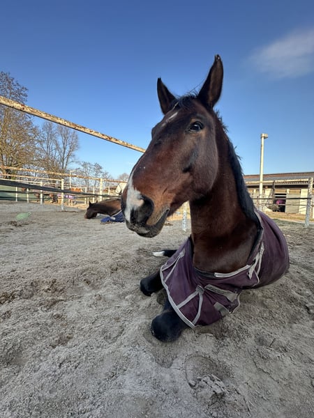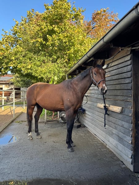 Neues Zuhause für meinen 15 jährigen bedingt reitbaren Selle Francaise Wallach gesucht Er war vier Jahre lang Schulpferd bei uns im Verein und ist jetzt seit über einem Jahr in meinem Besitz. Aus privaten Gründen muss ich ihn jetzt aber leider abgeben. Was ich mir für ihn wünsche: -Offenstall mit genug Bewegungsmöglichkeit für ein Arthrosepferd -kleine Herde (bevorzugt Wallachherde, aber aktuell steht er auch ohne Probleme in einer Paddockbox neben einer Stute) -er sollte 24/7 Heu bekommen, da er eher schwerfuttrig ist und ist und einen empfindlichen Magen hat Da er Arthrose in den Vorderbeinen hat (Röntgenbilder von Juli 25 vorhanden), wird er als bedingt reitbar abgegeben. Ansich kann er aber freizeitmäßig geritten werden. Er ist den Umgang mit Kindern durch die Reitschule gewöhnt, allerdings ist er kein Anfängerpferd und braucht einen sicheren Reiter. Im Gelände ist er vorallem in der Gruppe super entspannt. In unbekannten Situationen bleibt er lieber eher mal stehen um sich zu orientieren, zum durchgehen, bocken oder steigen neigt er aber nicht. Auf dem Platz braucht er einen ruhigen und geduldigen Reiter, da er gerne mal etwas übermotiviert wird. Er kennt es auch vom Boden gearbeitet werden, lässt sich am Halfter longieren und ist auch bei der Bodenarbeit aufmerksam dabei. Letztens haben wir klickern mit ihm angefangen, was er auch sehr schnell verstanden hat. Er ist regelmäßig geimpft und entwurmt worden. Die Zähne wurden im Dezember 2025 gemacht und er ist aktuell vorne beschlagen Standort 76149