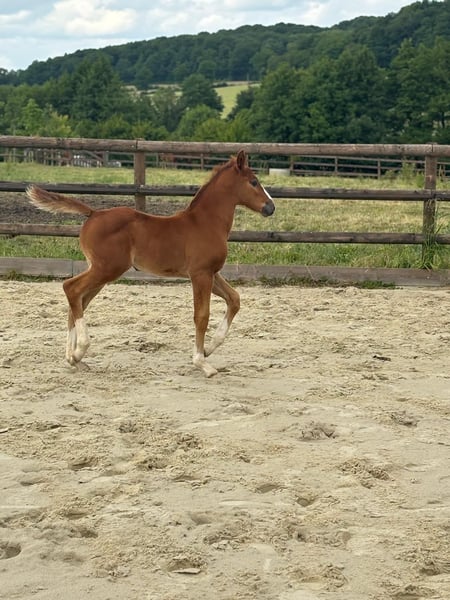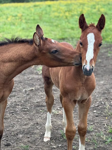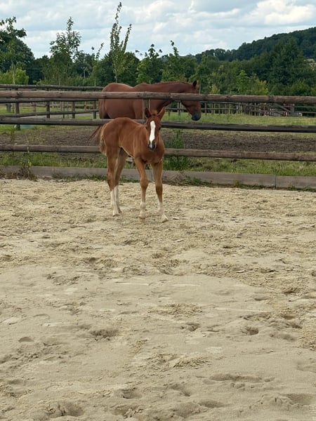 Fohlen der französischen Zuchtlinie von Untouchable 27 Brave Stute von Qlassic BM Old Chap brav Sehr sportliches Fohlen mit vielen Stärken.