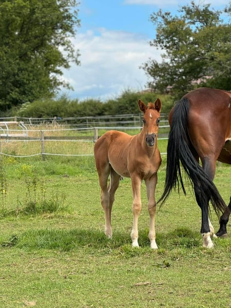 Pouliche de 2024 par Bon Cœur et Vitalis. Beaucoup de force pour cette pouliche très osseuse qui atteindra très certainement un bon 170-175cm ! Énergique et très à l’écoute, très proche de l’homme, c’est une pouliche tout en force mais d’une extrême gentillesse 🥰 Très bien manipulée, facile pour tout. 3 très belles allures avec notamment beaucoup de force dans les postérieurs au trot !