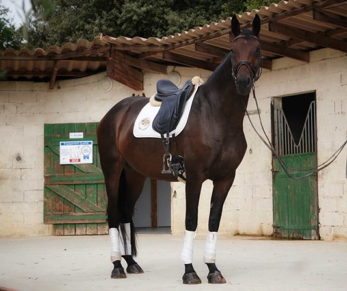 We are pleased to present a superb 5-year-old Selle Français mare, sired by Van Gogh du Val (by Fürst Romancier) and out of a mother by Pik Noir. This quality pedigree combines the strength and elegance of the sire with the consistency and renowned temperament of the dam line, thus offering an interesting potential for both future sports and breeding. Origins: Sire: Van Gogh du Val (by Fürst Romancier) – A modern and high-performing stallion, appreciated for his power, flexibility, and brilliant gaits. He passes on to his offspring an expressive locomotion and real potential for high-level dressage. Maternal Grandsire: Pik Noir – Descendant of a lineage recognized for the quality of its temperament, sturdiness, and consistency, he also brings strength and reliability. Qualities: This mare presents a harmonious and elegant model, with a supple and cadenced locomotion that immediately captivates. Her trot is characterized by a nice natural swing and beautiful elasticity, providing a pleasant riding comfort. Easy to showcase, she is well in her gaits, responsive, and always in front of the leg, making her work enjoyable and progressive. She is a very kind mare, easy to care for and handle daily, showing a close bond with humans and a balanced temperament. She has already foaled, making her an interesting mare for a future breeding project. Potential and Future: Thanks to her origins, positive attitude, and quality of locomotion, this mare has all the cards in hand to calmly progress towards the Amateur 1 level and beyond, while remaining a safe and pleasant mount for a rider wishing to advance. She represents a true opportunity for an informed amateur or a rider looking to combine pleasure, safety, and sporting potential, while ensuring a horse that is well-balanced and easy to manage on a daily basis.