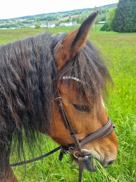 Eddie Enzo Freiberger Wallach Geb. 2015 Barhuf Aktuell Offenstallhaltung 152cm Mitte 2023 haben wir aus einem Schulbetrieb einen zweiten Freiberger gekauft für meinen Partner (Reitanfänger). Leider ist er kein Anfängerpferd, da er gerne buckelt. Wir haben ihn auf den Kopf stellen lassen (Blut, Röntgen, Magenspiegelung, PSSM 1 und 2 inkl Muskelbiopsie), es wurde aber nichts gefunden (ein ggr. Spatbefund ohne klinische Relevanz, hierzu gibt es sogar ein Gutachten). Seitdem er hier ist, wurde er 2023 noch professionell eingefahren (ein- und zweispännig). Ich fahre ihn nur am Zweispänner links und dort läuft er wirklich gut, fröhlich und engagiert. Allerdings fahre ich nicht soooo viel Kutsche, dass er genügend Bewegung hätte (weshalb er gerade auch echt fett ist). Er läuft fast täglich in der Führanlage und hat trotz seiner Figur eine super Kondition. Ansonsten habe ich Longe mit ihm neu aufgebaut, Verladetraining etc. Bodenarbeit kannte er schon und liebt er. Zu Beginn bin ich ihn auch draussen geritten, aber da fühlte ich mich wie auf einer Atombombe. Seit Anfang 2024 wird er nicht mehr geritten. Im Schulbetrieb vor uns hatte er wechselnde Reiter, war regelmäßig draussen und ist auch gesprungen. Ebenfalls lief er im Ponyclub mit sehr kleinen Kindern mit. Charakterlich ist er ein Kuschler, gutmütig mit Kindern, anhänglich, aber manchmal ein Nervenbündel ohne Grund. Ich verkaufe ihn als Kutschpferd. Geritten werden kann er sicherlich (er hat tolle Grundgangarten), aber seine Stärke und Vorliebe ist die Kutsche. Als Reitpferd ist er mir zu "unberechenbar". Ich wünsche mir für ihn Offenstall oder zumindest tagsüber in der Herde draussen (Box kennt er nicht wirklich) und mehr Bewegung und Ansprache als ich sie ihm bieten kann. Er ist regelmäßig geimpft, entwurmt und einmal jährlich wurden Zähne gemacht (zuletzt vor 2 Wochen). Bei weiteren Fragen gerne melden.