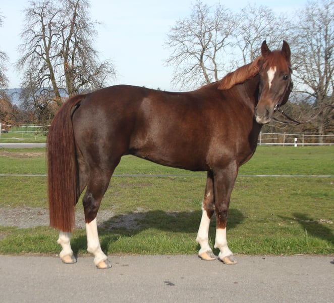 Stute, Fuchs, 155 cm, 11 jährig Bildhübsche Stute, welche top anständig, einfach und lieb im Umgang ist. Sie wird von Kindern, Jugendlichen und Erwachsenen im Gelände geritten. Hier zeigt sie sich sehr unkompliziert, nicht schreckhaft und motiviert. Auch wird sie oft alleine im Gelände ausgeritten. Natürlich ist sie top verkehrssicher, da bei jedem Ausritt auf der Strasse mit Traktoren, LKW, Fahrrad und Töff konfrontiert ist. Die Stute ist auch gefahren. Auch die Arbeit an der Longe sowie auf dem Sandplatz macht sie gerne. Sie kennt Boxen - und Offenstallhaltung, hier zeigt sie sich sehr sozial und ist mit anderen Pferden und Ponys sehr unkompliziert. Die Stute darf gerne besichtigt und ausprobiert werden - für weitere Infos etc gerne per Telefon.