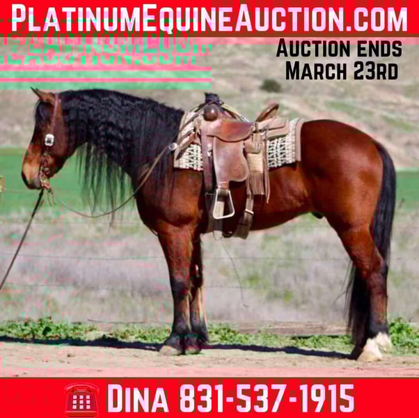 ONLINE AUCTION Place your bids at www.PlatinumEquineAuction.com Starting Bid $3500 Auction ends March 23rd, 2025 Need a new saddle? Check out White Rock Saddles on our website or Facebook! Meet Arthur – Your Perfect Trail Companion! I am proud to introduce you to Arthur, a truly remarkable Friesian gelding who is not just beautiful but also incredibly intelligent and friendly. With his stunning long mane and tail, Arthur is sure to turn heads wherever you take him. Standing at 15.1 hands tall and 10 years old, Arthur is a safe and gentle companion who will take you on adventures with calmness and confidence. He has extensive trail riding experience, effortlessly crossing water, logs, and ditches while navigating various terrains with care and surefootedness. Arthur is quiet-natured and responsive, moving off leg cues with ease. He has been ridden both English and Western, showcasing a smooth flowing trot and the ability to lope nice circles. He has been successfully ridden by youth riders, proving to be a horse that truly aims to please. Whether riding alone or in a group, Arthur remains brave and composed, even in new environments. He has participated in several holiday parades, demonstrating his calm demeanor amidst commotion, traffic, and noise. Arthur is well-mannered, enjoys human companionship, and gets along wonderfully with other horses. He is accustomed to various equipment, including cars, tractors, and quads, making him a versatile partner. Arthur stands patiently for tacking, mounting, and grooming, and he is comfortable riding bareback. He hauls great and is comfortable in new surroundings. Arthur has been used to gather cattle is great in the branding pen and he is very accustomed to doing ranch work. He has tackled all trail obstacles with ease and is especially suited for timid riders, making him a great choice for anyone seeking a lifelong partner. He has been great with bridges, tarps , bouncy balls and flying flags. Arthur is a kind soul who will be an asset to any family. Whether you’re looking for a trail companion, potential show horse, or a fancy ranch horse he has it all. Arthur can excel at just about anything you throw his way and he will look beautiful doing it. Please feel free to contact Dina at Longhorn Ranch at 831-537-1915 for more information. You won’t be disappointed in meeting this incredible horse! ONLINE AUCTION Place your bids at www.PlatinumEquineAuction.com Starting Bid $3500 Auction ends March 23rd, 2025 Need a new saddle? Check out White Rock Saddles on our website or Facebook!