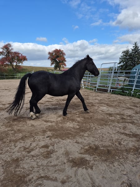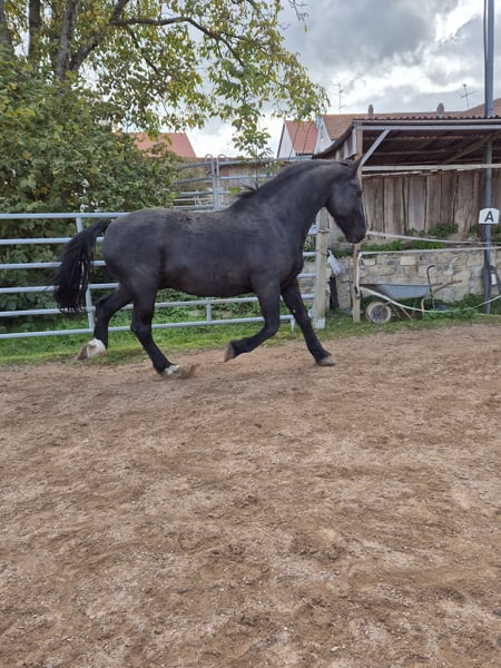 Hallo leider muss ich mich schweren Herzens aus persönlichen Gründen von meinem tollen Friesen mix Wallach trennen. Er ist ca 170cm groß und 11 Jahre alt. Er wurde von mir schonend am Boden und im Sattel ausgebildet. Am Boden liebt er zirzensik. Ich bin als er noch jung war viel mit ihm spazieren gewesen und habe viel bodenarbeit gemacht unter anderen, zirzensik, longieren, Freispringen( nicht seine lieblings Disziplin), equikinetik, Schrecktraining, kleine Trails und hängertraining. Auch war ich schon bei auswärtstraining mit ihm. Seitdem weiß er leider wenn man ihn wegfahren möchte, dann steigt er sehr ungern in den hänger. Beim verladetraining ist das einladen kein Problem. Unter dem Sattel bin ich ihn nur Schritt und Trapp auf dem Platz geritten da kann er aber auch schon vieles. Zb. Konterschulterhein, Schulterherein und Travers. In der Herde ist er sehr rangniedrig sodass er viel von den anderen herumgeschickt wird. Deswegen steht er bei mir in einer sehr großzügigen Paddockbox mit Weidegang. Dies wünsche ich mir für ihn auch weiterhin, dass er nicht in einen Offenstall muss wo er nur weggeschickt wird. Er ist ein kleiner quatschkopf und für alles zu haben, wenn er in seiner komfortzone bleiben darf. Versucht man ihn aus dieser herauszuholen wird er ängstlich und weiß sich durchzusetzen oder auch mal davon zu rennen. Deswegen nur an erfahrene, durchsetzungsfähige pferdeleute zu verkaufen. Hat man ihn auf seiner Seite und befindet man sich in einer komfortzone so ist er das liebste Pferd. Leider komme ich auf grund von zeitmangel nicht dazu ihn weiter auszubilden und deswegen steht er schon sehr lange. Ein probereiten ist nach Absprache möglich, da kann auch das verlassen der komfortzone genauer gezeigt werden. Für ein probereiten werden 40 Euro verlangt die beim Kauf verrechnet werden. Er war immer gesund und hat einen sehr starken Körperbau. Er läuft barhuf hat sehr feste Hufe und ist regelmäßig beim hufschmied Er ist regelmäßig Tetanus geimpft und auch entwurmt worden. Kommt aus den Niederlanden und hat keinen abstammungsnachweis. Bei weiteren Fragen gerne melden.
