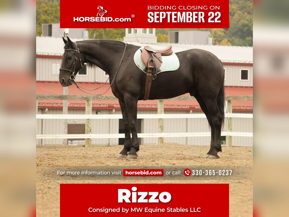 🍁𝒕𝒉𝒆 𝐅𝐀𝐋𝐋 𝑺𝒑𝒆𝒄𝒕𝒂𝒄𝒖𝒍𝒂𝒓🍁 Happening now thru MONDAY | SEPTEMBER 22nd - Available EXCLUSIVELY on HorseBid's website! For more details and to register visit: www.Horsebid.com CONSIGNOR CONTACT: MW Equine Stables LLC 330-365-0237 LOCATION: Fresno, OH BREED: Friesian Sporthorse (Friesian/Percheron/Morgan) REGISTERED: No COLOR: Black HEIGHT: 16.3 AGE: 10 GENDER: Gelding Rizzo Is a total dream horse that will get heads turning no matter where you take him. He is a 16.3 2015 Friesian Sporthorse (Friesian/Percheron/Morgan) gelding. Rizzo has no funny business and enjoys having a job and is extremely willing. He has a solid W/T/C both directions. He has a ground covering stride and pretty movement. strives to please and has work ethic. He is schooling First/Second level. Scoring First level tests in the 70’s. Jumping 3ft courses with changes, with plenty of scope. He has no buck rear or kick. He loves to trail ride and crosses all obstacles. He had been Fox hunted frequently and hunted first and second with no issues. On the trail, Rizz will happily go in the front or back of the pack. This brave boy is the first one into the water, be it crossing the stream, or going for a swim in the lake. He’s good in a group with horses riding up close behind him and doesn’t get upset. In the barn, Rizz has no bad stall habits He picks up all four feet and is good for the farrier. He stands to groom, clipped and saddled. He never causes problems in the pasture and gets along with everyone. He is a gentleman no matter the situation I trust him to take care of any level rider. Has been lightly used in lesson program and is my guest/friend/family horse for any trail or outing with inexperienced riders. Call or text 330-365-0233