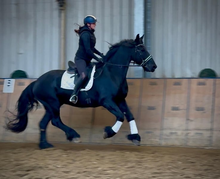 Name: Pol v.d. Strohoeve Breed: Friesian Gender: Gelding Date of Birth: April 10, 2013 Age: 10 years Height: 16.1 hh Color: Black Pedigree: with pedigree certificate Temperament: personable, reliable, patient, curious, intelligent, brave Training/ suitability: leisure riding, dressage, baroque riding Trail Experience: attentive, dependable, fearless, comfortable alone or in a group Health: dewormed, vaccinated, barefoot, eczema-free, teeth checked, osteopathically treated Stabling: box stall, open stable Special Features: farrier and loading safe, herd-friendly The listed qualities are based on our personal assessment and do not constitute a guarantee of traits. Price: €8,500 (gross price) Have we sparked your interest? To give you a better impression of Pol, we are happy to send you a video of him riding. Of course, we are available for a detailed description of the horse, personal consultation, and to answer all your questions via phone. Please feel free to contact us anytime via WhatsApp message or call us at: +49 151 19487595 Our phone hours are daily from 7:00 AM to 1:30 PM and again from 8:00 PM. We look forward to hearing from you! A clinical or radiological purchase examination can be performed by your veterinarian of choice. Pol can be safely and comfortably delivered to his new home. We handle all necessary preparations and transport to ensure your new horse arrives stress-free, well cared for, insured, and in good health. Currently, we offer a carefully selected variety of horses for sale. With us, you are sure to find your dream horse. Feel free to visit our website at www.marvinsroyalhorses.de. Dear customers, we are happy to introduce you to our horses and offer grooming, tacking, lunging, ground work, as well as trial riding in the riding hall, on the arena, or in the field to help you get to know your new family member. The fee is €40 per horse, with each additional horse €30, and will be refunded upon purchase. Our address: Ferdinand Grube 50 53577 Neustadt-Wied Google Maps: marvinsroyalhorses
