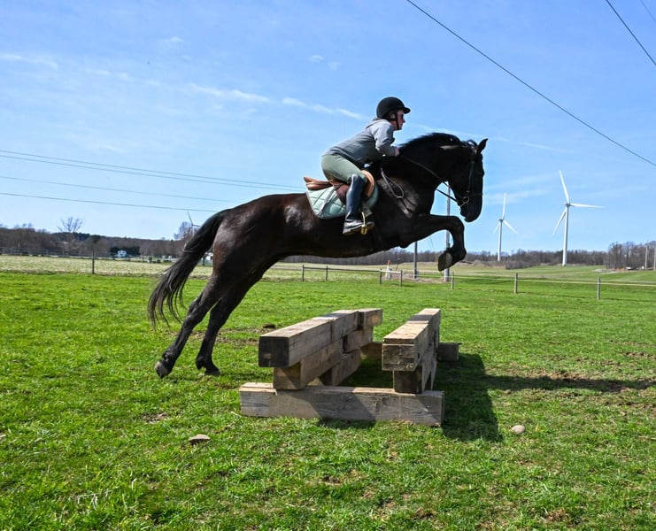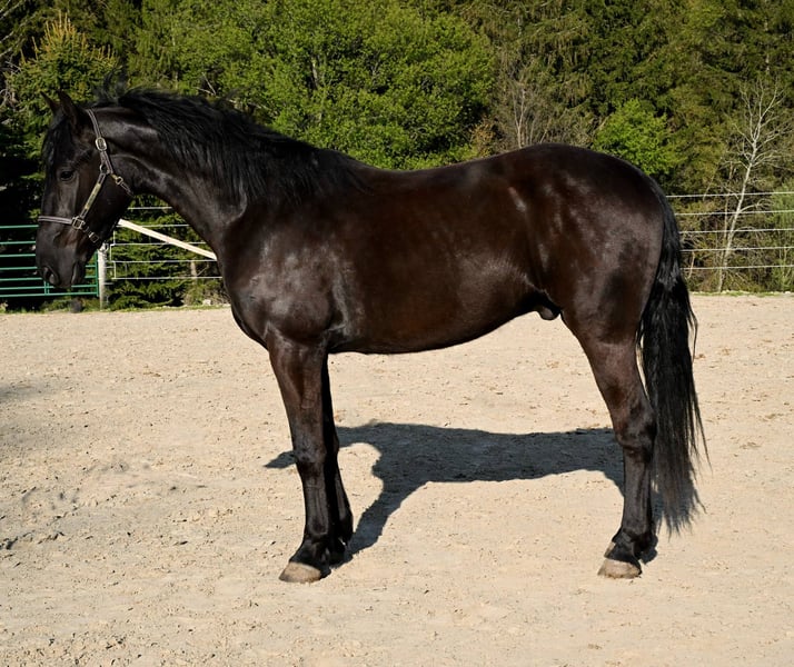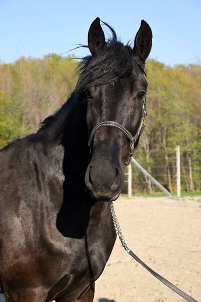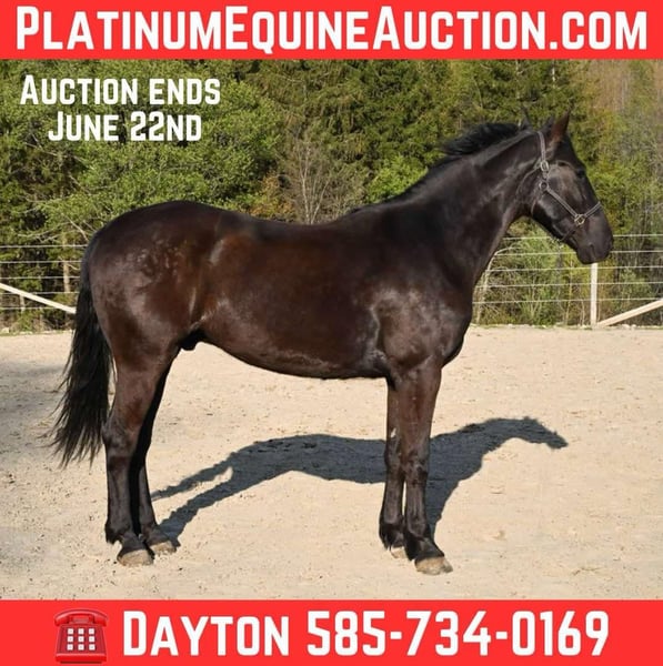 ONLINE AUCTION Place your bids at www.PlatinumEquineAuction.com Starting Bid $3500 Auction ends June 22nd, 2025 Need a new saddle? Check out White Rock Saddles on our website or Facebook! Sable is a stunning 4-year-old Friesian/Morgan cross gelding standing a solid 15.3hh. He has the kindest eye and an incredibly sweet, puppy-dog personality. Sable is solid broke and ready to head in any direction you choose—whether you’re looking for a confident trail partner, a lesson horse, a pleasure horse for arena work, or a show partner, Sable fits the bill. He rides out quietly alone or in a group and gets along with every horse he meets. With his calm demeanor and eagerness to please, Sable is the kind of horse that’s easy to fall in love with. He’s smooth and steady at the walk, trot, and canter, and goes both English and Western—perfect for someone who enjoys variety. He confidently crosses bridges, rides through water, and handles all kinds of farm animals with ease. He gives 100% every time and is a true joy to ride—so much so that we’ve used him in both youth and adult lessons. He’s been ridden all over the farm by an 8-year-old girl in the video, showcasing just how gentle and reliable he is. Sable is sound, healthy, and has no special dietary needs. He’s barefoot with great feet, trailers like a dream, and stands politely for the vet and farrier. With his whole life ahead of him, this sweet gelding is ready to become someone’s best friend and trusted partner for many years to come. Sable is located in Warsaw, NY. Contact Dayton Wolcott 585-734-0169 for more info or to come meet Sable! ONLINE AUCTION Place your bids at www.PlatinumEquineAuction.com Starting Bid $3500 Auction ends June 22nd, 2025 Need a new saddle? Check out White Rock Saddles on our website or Facebook!
