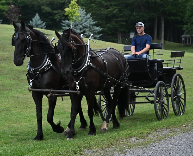 ⚜️𝐓𝐇𝐄 𝐅𝐀𝐋𝐋 𝐇𝐄𝐑𝐈𝐓𝐀𝐆𝐄 𝐂𝐋𝐀𝐒𝐒𝐈𝐂⚜️ Happening now thru MONDAY | NOVEMBER 3rd - Available EXCLUSIVELY on HorseBid's website! For more details and to register visit: www.Horsebid.com CONSIGNOR CONTACT: Wolcott’s Versatility Horses and Training 585-734-0169 LOCATION: Warsaw, NY BREED: Friesian Sport horse REGISTERED: Yes REGISTERED NAME: Bonnie and Clyde COLOR: Black HEIGHT: 16.3 AGE: 5 GENDER: Gelding Introducing Bonnie & Clyde, a registered, fully-matched Friesian sport horse driving team. Bonnie and Clyde are perfect examples of what a team should look like. Their movement and self-carriage speak for themselves. Perfectly synchronized while driving, Roman riding, or out in the pasture, this team is ready for the show ring, ceremonial events, or a lifetime of elegant pleasure driving and riding! Bonnie is a 5-year mare, and Clyde is a 4-year gelding. They are full siblings standing at 16.3hh! This team is the whole package. They ride very well in the arena and out on the trail. They will work alone without calling out for the other one. Even though they have been together their whole lives, they are not buddy sour! Bonnie and Clyde have been to many shows, clinics, dressage schoolings, and obstacle challenges! They handled everything with ease! They both have a very smooth w/t/c in the arena and outside! They have been used for lessons from kids to adults; everyone gets along with them. The kids will take them out on the obstacle course or on the trail alone! They will easily cross water, bridges, and any obstacle you encounter. When it comes to driving, this team has been hooked on all different styles of carts and carriages and never bothered with any of them. We have used them for our carriage rides around the farm and off property, and they acted like an old seasoned team! They are traffic safe and have seen many trips down the road passing semis and cars. They are very quiet in the barn; they will stand to get groomed, clipped, bathed, and for the vet. Bonnie and Clyde sell 100% sound and with zero vices! Contact Dayton at 585-734-0169 for more information. Located in Warsaw, Ny!