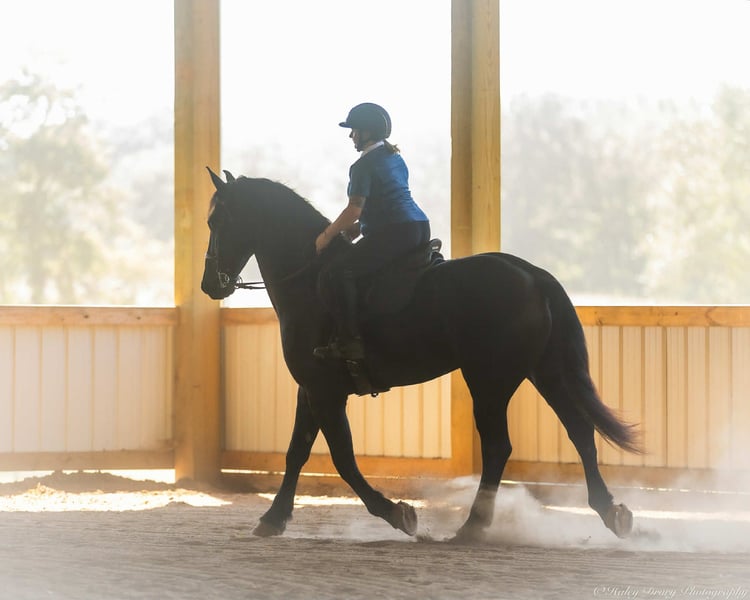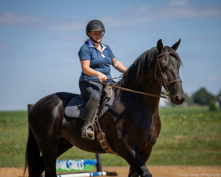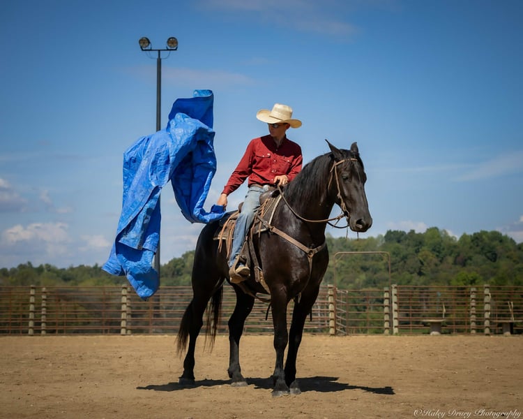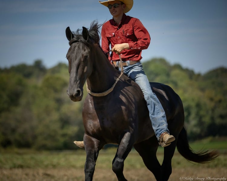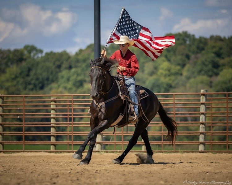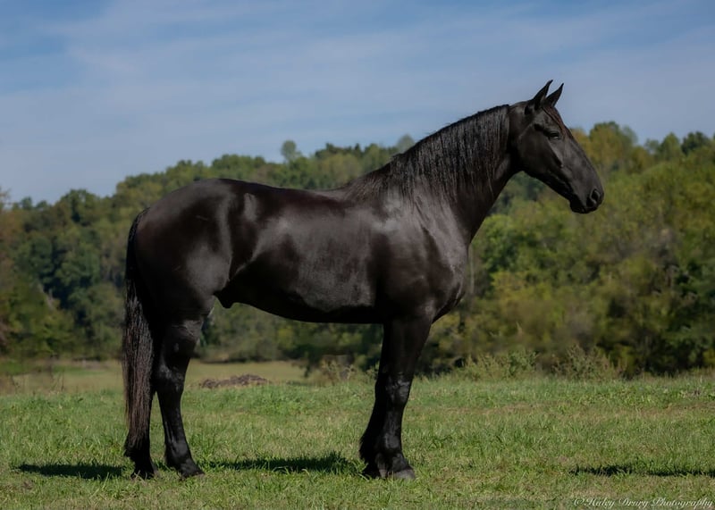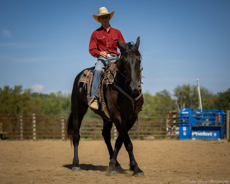 ♦️ 𝐭𝐡𝐞 𝐀𝐌𝐄𝐑𝐈𝐂𝐀𝐍 𝓕𝓪𝓵𝓵 𝓒𝓵𝓪𝓼𝓼𝓲𝓬 ♦️ Happening now thru MONDAY | OCTOBER 20th - Available EXCLUSIVELY on HorseBid's website! For more details and to register visit: www.Horsebid.com CONSIGNOR CONTACT: Jamie Thomason 270-772-1706 LOCATION: Auburn, KY BREED: Friesian Cross REGISTERED: Yes REGISTERED NAME: BIRCH FARM TED COLOR: Black HEIGHT: 16.3 AGE: 4 GENDER: Gelding The definition of equine luxury — a striking, jet-black, gelding with the size, style, and presence to turn heads! ROYCE is a 4 yr old, 1/2 Friesian, 1/4 Morgan, 1/4 Percheron Gelding registered in the Friesian Heritage Horse association, standing at 16.3 hands tall. Royce walk-trot-canters both directions, picks up the correct leads. Transitions smoothly, moves laterally, light in the bridle, & stops from your seat or a simple “whoa”. Royce is always willing, eager to learn, & forgiving making him suitable for a variety of riders and disciplines. No saddle, no bridle, no problem! Climb on and enjoy a leisurely stroll. Royce still stops, still steers, & still walk, trot, canters with nothing more than leg aids & a rope around his neck! On the trail, Royce hacks out alone or in a group. Content to lead or follow. Crosses water, goes up & down inclines, over bridges, through wooded paths, and across open pastures. Royce is easy to load, haul, and is unbothered in new settings. Myself, my daughter & her friends have taken him along to State & National Parks on day rides, he is unbothered by wildlife, hikers, and other passing riders. Always a fun time! On the farm, Royce has worked along stock dogs to move cattle. He’s ridden along side tractors, combines, atv’s, and other machinery without issue. He is traffic safe, gun safe, unbothered by waving tarps, and proudly carries the flag. Safe & seasoned around kids, dogs, cattle & other livestock. At home, Royce is exceptional. A gentleman on the ground, respectful on the lead, stands tied, cross tied, and is a very personable horse. If Royce is in the pasture, he’ll follow right behind me to the barn. My toddler is typically along for chores and Royce is always careful. He lowers his head for my son give him a pat and is extremely tolerant of a wild little boy in the barn. Royce has zero stall vices, always neat & tidy. Also perfectly content outside alone or in a mixed herd. Whether you're looking for a reliable partner for everyday riding or a head-turner with a calm, willing attitude, Royce is the kind of horse you don’t come across often. A true gentleman ready for his next adventure! If you would like to meet Royce prior to adding him to your family or have any other questions, feel free to reach out!