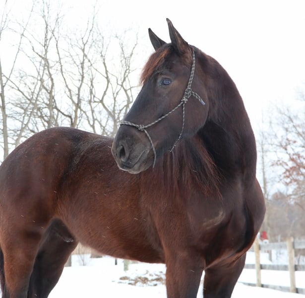 "AVAILABLE ON ONLINE HORSE AUCTION AT www DOT MagicHorseAuction DOT com BIDDING OPEN NOW thru TUESDAY | MARCH 17TH! BUY IT NOW AVAILABLE! *Final price will be determined on auction site* CONSIGNOR CONTACT INFO:ELLESSEE SCHWARTZ #248-390-6831 LOCATION:Howell, MI" Meet MVS Midnight Majestic or “Knight” as we call him at home. He’s a registered 5 year old 17hh Friesian Heritage Horse. Knight is sired by the legendary Fermin P by Mintse 384 and out of a Mindy a Percheron mare. He carries himself with a ton of presence and elegance. Knight has excellent bone structure and conformation. He’s big, he’s quiet he’s, sensible and he’s well rounded. Knight is a total love to be around, he enjoys company and soaks up attention. He’s no stranger to activities and kids! Knight is broke to both ride and drive and is a very willing partner. He has been trail ridden and driven. He has been driven all over Michigan Ohio and Iowa and is traffic and road safe. He’s a calm natured but yet inquisitive horse. Knight has 3 beautiful gaits under-saddle and excellent breaks. He has a nice walk an elegant and floaty trot and rocking horse canter. He takes both leads effortlessly. This horse is absolutely stunning. The type that will steal your heart at first sight. He is safe sound and extremely good looking! A hard kind to find. He will excel in dressage, lower level jumping, trail riding and driving or just as an all around family horse!