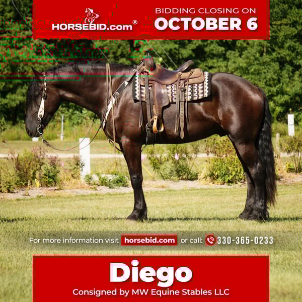 🍂 𝓐𝓾𝓽𝓾𝓶𝓷 𝑨𝑳𝑳 𝑺𝑻𝑨𝑹 𝑳𝑰𝑵𝑬𝑼𝑷 🍂 Happening now thru MONDAY | OCTOBER 6th - Available EXCLUSIVELY on HorseBid's website! For more details and to register visit: www.Horsebid.com CONSIGNOR CONTACT: MW Equine Stables LLC 330-365-0233 LOCATION: Fresno, OH BREED: Friesian/Percheron Cross REGISTERED: No COLOR: Black HEIGHT: 17.2 AGE: 5 GENDER: Gelding 🤩Take a Look at Diego …. You will not find another one like him‼️ Diego is a 5 year-old 50% Friesian 50% Percheron cross gelding. He stands around 17.2 hands. If beauty and elegance are what you’re looking for, then Diego is your guy! He has all the beautiful Friesian characteristics. Diego will do anything you ask of him. This is once in a lifetime Opportunity. Not every day do they come along like Diego ! He is quiet, calm, and collective. With his rocking chair canter, and his beautiful, elegant trot, Diego will have everyone noticing you! He is broke to ride and drive the very best . He crosses bridges, walk through the deepest waters, and will jump over the logs . He rides Western, English, bridal-less and drives. Diego also knows a few tricks, like lay down and sit.. He is a complete gentleman to be around whether being handled on the ground or under saddle. Diego makes beautiful, smooth, lead departures, great transitions, takes his lead correctly every time, and is very willing to work for you. He has been exposed to everything on the trails, making him even more prepared for the excitement that happens outside of the Arena. Diego stands crosstied , and patiently waits while bathing and being groomed , and tacked up, and bridal. While riding through town, you can take him anywhere! Down, busy, sidewalks, and streets, through parking lots of vehicles and pedestrians, across bridges, and he will have the same ride every time. On the trails, Diego will keep his rider safe. Gracefully stepping over logs, through creeks, and all kinds of obstacles you might encounter. When going for a carriage ride, Diego is easy to harness and hitch. He is trained, single and double. He will take you down busy highways, Streets , and make you feel like an absolute Rockstar . He looks stunning under harness and has enough style to stand out on the big city streets. If you’re searching for your next all around prospect ,carriage horse, family horse, or trail horse… ☑️Diego checks every box! It is a big world and the opportunities for large gelding are very rare. If you’re in the market for your forever horse, here he is! ☎️ FMI Contact Marcus @ 330-365-0233 Located in Fresno, Ohio …… Nationwide Shipping Available ‼️Feel Free to schedule a ride with Diego at our farm ‼️