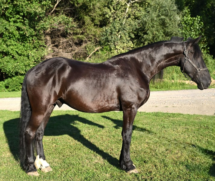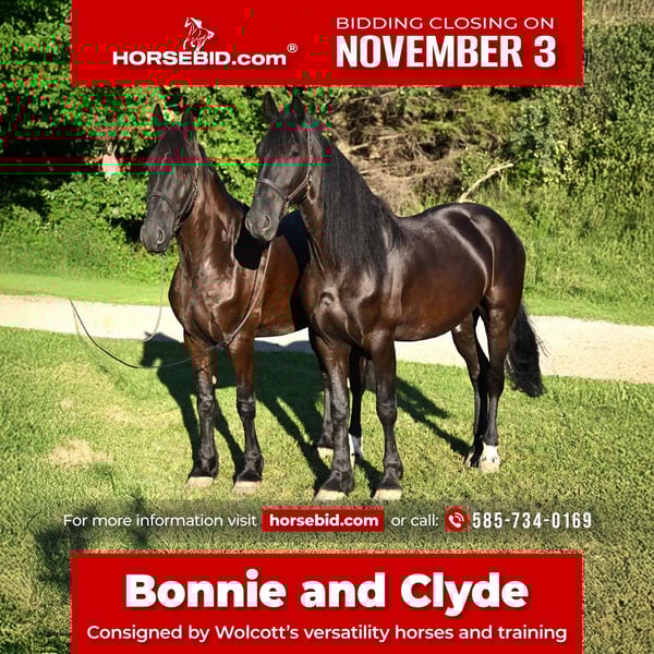 ⚜️𝐓𝐇𝐄 𝐅𝐀𝐋𝐋 𝐇𝐄𝐑𝐈𝐓𝐀𝐆𝐄 𝐂𝐋𝐀𝐒𝐒𝐈𝐂⚜️ Happening now thru MONDAY | NOVEMBER 3rd - Available EXCLUSIVELY on HorseBid's website! For more details and to register visit: www.Horsebid.com CONSIGNOR CONTACT: Wolcott’s Versatility Horses and Training 585-734-0169 LOCATION: Warsaw, NY BREED: Friesian Sport horse REGISTERED: Yes REGISTERED NAME: Bonnie and Clyde COLOR: Black HEIGHT: 16.3 AGE: 5 GENDER: Gelding Introducing Bonnie & Clyde, a registered, fully-matched Friesian sport horse driving team. Bonnie and Clyde are perfect examples of what a team should look like. Their movement and self-carriage speak for themselves. Perfectly synchronized while driving, Roman riding, or out in the pasture, this team is ready for the show ring, ceremonial events, or a lifetime of elegant pleasure driving and riding! Bonnie is a 5-year mare, and Clyde is a 4-year gelding. They are full siblings standing at 16.3hh! This team is the whole package. They ride very well in the arena and out on the trail. They will work alone without calling out for the other one. Even though they have been together their whole lives, they are not buddy sour! Bonnie and Clyde have been to many shows, clinics, dressage schoolings, and obstacle challenges! They handled everything with ease! They both have a very smooth w/t/c in the arena and outside! They have been used for lessons from kids to adults; everyone gets along with them. The kids will take them out on the obstacle course or on the trail alone! They will easily cross water, bridges, and any obstacle you encounter. When it comes to driving, this team has been hooked on all different styles of carts and carriages and never bothered with any of them. We have used them for our carriage rides around the farm and off property, and they acted like an old seasoned team! They are traffic safe and have seen many trips down the road passing semis and cars. They are very quiet in the barn; they will stand to get groomed, clipped, bathed, and for the vet. Bonnie and Clyde sell 100% sound and with zero vices! Contact Dayton at 585-734-0169 for more information. Located in Warsaw, Ny!