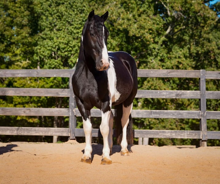 🎲𝓽𝓱𝓮 𝐑𝐈𝐃𝐄𝐑'𝐒 𝓒𝓱𝓸𝓲𝓬𝓮🎲 Happening now thru MONDAY | NOVEMBER 17th - Available EXCLUSIVELY on HorseBid's website! For more details and to register visit: www.Horsebid.com CONSIGNOR CONTACT: Carolina Sport Horses 704-249-8500 LOCATION: Clover SC BREED: Friesian Spotted Draft X REGISTERED: No COLOR: Black and White Paint HEIGHT: 15.2 AGE: 6 GENDER: Gelding Meet Solomon, a stunning 6-year-old Friesian Draft cross gelding who embodies everything today’s discerning rider looks for — presence, patience, and pure versatility. Standing 15.2 hands and weighing in at a solid 1,400 lbs, he carries himself with the balance and confidence of a seasoned schoolmaster, yet the kindness and forgiveness that make him an ideal family or program horse. Solomon offers a comfortable, rhythmic walk, trot, and canter, all beautifully balanced. Whether in the arena or out on the trail, he is steady, surefooted, and exceptionally safe. His transitions are smooth and his demeanor calm — making him a pleasure for riders of all skill levels. Solomon has been schooled by riders as young as nine, and he meets every one of them with quiet patience. He’s trustworthy enough for children or beginners, yet talented enough to satisfy more advanced riders who appreciate refinement, power, and beauty in one package. He’s equally at home carrying a first-time rider as he is under a professional’s instruction. In the barn, Solomon is a true gentleman — patient to groom, tack, bathe, and handle. He enjoys attention, trailers with ease, and stands quietly for farrier and vet. His sweet personality and calm, gentle eyes win over everyone he meets. A Once-in-a-Lifetime Partner! If you’ve been searching for a horse that checks every box — beauty, temperament, size, and training — look no further than Solomon. He’s the kind of horse that gives riders confidence, families peace of mind, and trainers pride in his every step. *All of our descriptions are OUR OPINION and ARE NOT FACTS. They represent how the horse responded and behaved while in our care. Horses can change at any time as they are living, breathing animals. There are no warranties expressed or implied via the descriptions above*PLEASE READ OUR BUYERS GUIDE PRIOR TO BUYING OR BIDDING ON ANY HORSE WE HAVE AVAILABLE.