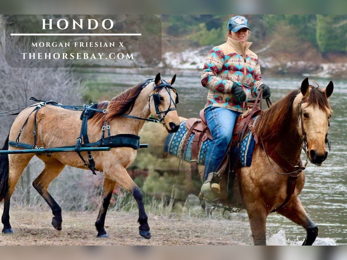Lernen Sie Hondo kennen, einen 1,52 m großen Buckskin-Gelding, der sowohl reiten als auch fahren kann! Er ist so vielseitig wie er attraktiv ist! Er ist halb Morgan, ein Viertel Friesian und ein Viertel Tennessee Walking Horse. Allerdings ist er kein Gaited Horse, doch seine Gangarten sind äußerst geschmeidig. Sein Galopp ist angenehm zu sitzen, und sein Trab ist sehr weich, sodass man leicht auf- oder aus dem Sattel aufsteigen kann. Unter dem Sattel macht Hondo riesigen Spaß. Er folgt jedem Kommando ohne Zögern und ist sehr trail-erfahren. Er überquert problemlos Wasser, Brücken, Baumstämme und mehr. Er springt steile Böschungen hoch und manövriert vorsichtig einen steilen Hang hinunter. Er ist kein schreckhaftes Pferd, sondern hat eine ruhige, erfahrene Einstellung. Er ist ein echtes Trail-Monster, mit dem man überall hinreisen kann. Er ist verkehrssicher: Er hat bereits Schnee- und Motorräder, Sattelzüge und andere Fahrzeuge gesehen. Der Verkehr macht ihm nichts aus. Er ist auch mit Wildtieren vertraut: Wir haben Truthähne in den Bäumen erschreckt, die über seinem Kopf weggeflogen sind, ohne dass er auch nur die Ohren spitzte. Er ist gewohnt, Tramp, seinen Hundekumpel, bei seinen Streifzügen zu beobachten, und es ist süß, zuzusehen, wie Tramp versucht, mit ihm zu spielen. Er ist kein Problem, wenn ein Hund mit ihm unterwegs ist, der im Gebüsch herumtobt oder auf ihn zustürmt. Hondo verträgt sich gut in der Herde. Er steht eher im unteren bis mittleren Rang. Er lässt sich gut vom Hufschmied beschlagen, ist einfach zu satteln und zu besteigen. Er ist leicht zu fangen, lädt problemlos in den Anhänger und fährt auch gut. Er verlässt das Zuhause alleine ohne Probleme und kann auch auf dem Trail von den anderen Pferden getrennt werden. Er kann sowohl die Führung übernehmen als auch folgen. Beim Fahren steht er ruhig beim Anbinden, beim Auf- und Absteigen vom Wagen. Er hält an Stoppschildern und Ampeln an und ist völlig unbeeindruckt vom Verkehr. Er hat bereits mehr Verkehr erlebt, als in dem Video zu sehen ist. Er wurde mit einem Gurtstrick gefahren, was kein Problem ist. Ich lasse ihn jetzt weg, weil er beim Anlegen immer den Schwanz straff anzieht und den Eindruck hat, dass er den Gurtstrick unter dem Schwanz nicht mag. Er hat nie etwas Schlechtes mit einem Gurtstrick gemacht, aber ich fahre ihn lieber ohne, um seinen Komfort zu gewährleisten. Er hat einen guten Widerrist, um das Sattelzeug zu tragen, und braucht keinen Gurtstrick. Für das Fahren empfehle ich ihn für einen fortgeschrittenen Fahrer, der Erfahrung mit Pferdefahrzeugen hat. Hondo ist absolut sicher: kein Buckeln, kein Rückwärtsgehen, kein Treten, Beißen oder andere schlechte Angewohnheiten. Er hat mittlere Gangarten, manchmal einen langsamen Galopp oder einen gemütlichen Trab. Wenn er einen Monat lang nicht genutzt wird, bleibt er derselbe, nur dass er nach den ersten Ritten wieder etwas schneller unterwegs ist. Danach kehrt er zu seinem mittel- bis langsamen Tempo zurück. Er ist kein heißes Pferd, aber auch nicht faul. Er ist ein typischer Morgan, der gern in Bewegung ist, aber er kann auch gehen, wenn man es möchte, sei es Schritt oder Trab. Hondo ist vollständig geimpft, entwurmt, hat einen aktuellen Coggins-Test, wurde vom Tierarzt untersucht und vom Hufschmied gepflegt. Kürzlich wurden seine Zähne gemacht. Kontaktieren Sie mich gern, um ihn zu besichtigen oder bei Fragen.