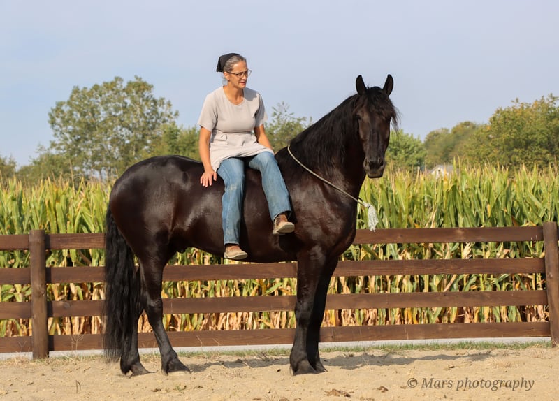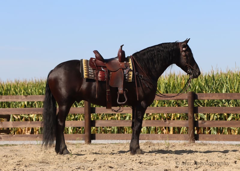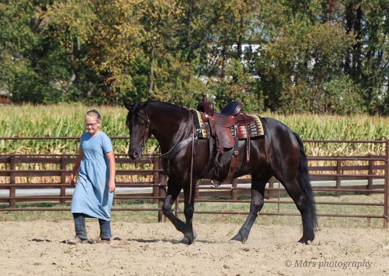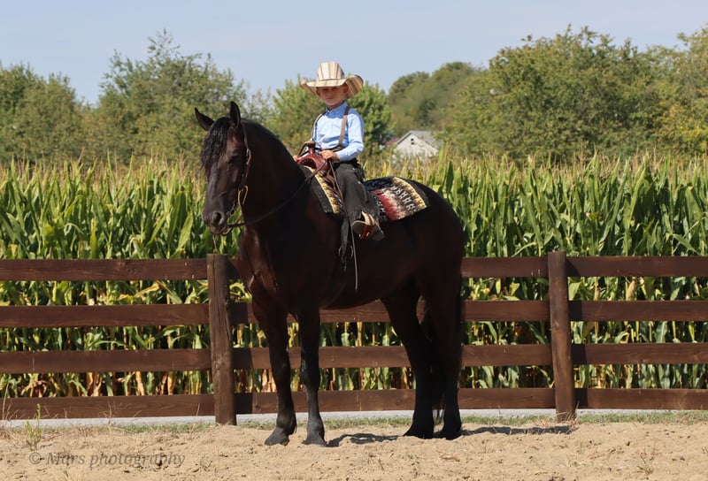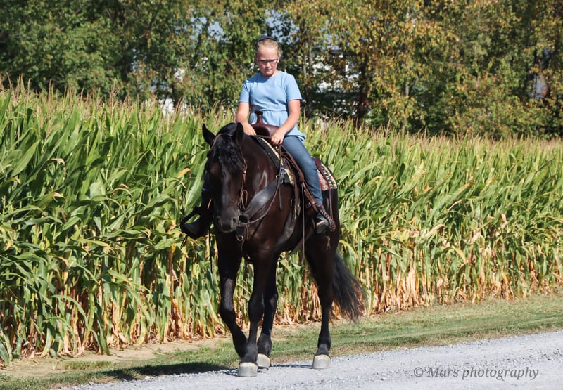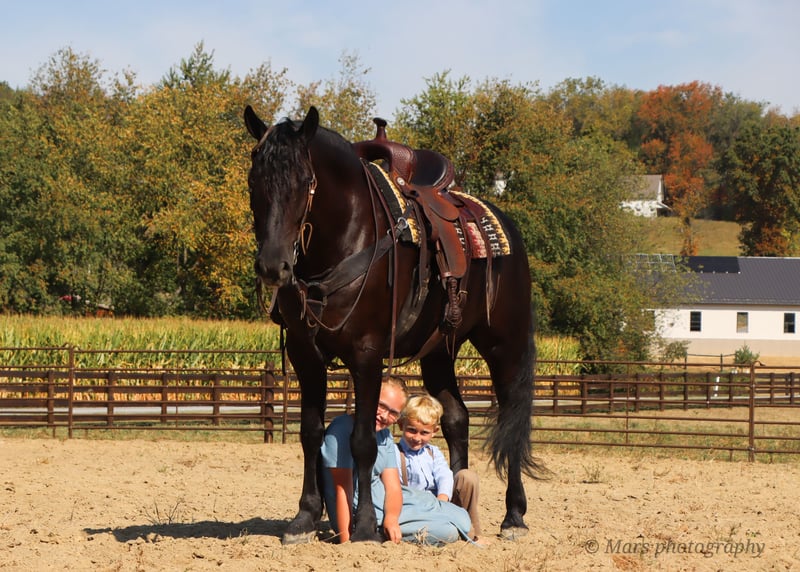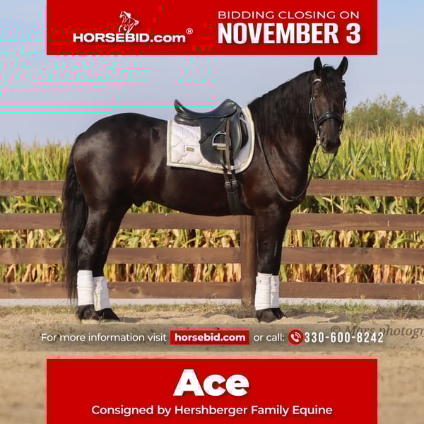 ⚜️𝐓𝐇𝐄 𝐅𝐀𝐋𝐋 𝐇𝐄𝐑𝐈𝐓𝐀𝐆𝐄 𝐂𝐋𝐀𝐒𝐒𝐈𝐂⚜️ Happening now thru MONDAY | NOVEMBER 3rd - Available EXCLUSIVELY on HorseBid's website! For more details and to register visit: www.Horsebid.com CONSIGNOR CONTACT: Hershberger Family Equine 330-600-8242 LOCATION: Sugarcreek, OH BREED: Friesian Sporthorse REGISTERED: Yes REGISTERED NAME: A-J'S Ace COLOR: Black HEIGHT: 15.3 AGE: 6 GENDER: Gelding If your looking for your very own plack beauty here is your guy!! Ace is 6yr. Old registered FSHR gelding. Standing at 15.3 hand tall. Ace is a true gentleman quiet, willing to please, safe and handsome. He has been with our family for the last 3 1/2yrs. He's been ridden western, English, bareback and brideless. He side pass to easily open and close gates. My 10 yr old and 6yr old kids get him out and rides him by themself. My kids will spend hrs playing with him from riding double, running around him chasing each other or simply enjoying a big horse they can canter around. He will walk, trot, canter and pick up both leads. Ace is easy to catch in the pasture, gets along well with others and is easy to Keep inside or outside. He stands great for the farrier, tacking up, grooming and baths. He will load on a taiter. Ace can be ridden in in groups, alone, on the road, open field, trails or arena. He has been ridden on Camping trips, in the dark and does well with a buddy seat.He will cross water, logs and conquers rough terrain with ease. Ace also does well in the carriage, been driven on State roads, through town and does great in traffic. He is up to date or on vaccine and dewormer. If Ace Sounds like the perfect fit for you, but you want to try him in person before contact Joanna to schedule a visit. You can also do a PPE if that is something you want to do.