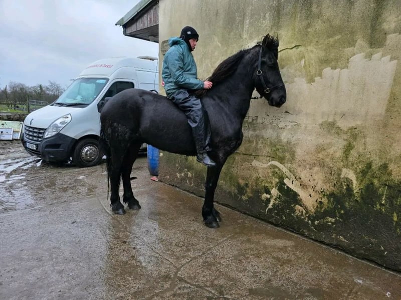 Équidé friesien pur noir impressionnant, mesurant 1,65 m (16,1 hh) et âgé de 7 ans. Boo est un cheval extrêmement beau et talentueux. Il semble littéralement flotter au sol dans tous ses allures. Il a été monté en dressage comme en équitation western, et il a accumulé de nombreuses heures en extérieur ainsi qu’un entraînement en manège. Il peut partir en randonnée en montagne pour la chasse ou pour des balades tranquilles sans problème. Il a été exposé à du gibier mort et a été chargé. Boo connaît le travail quotidien à la ferme et est familiarisé avec le bétail et la corde. C’est un cheval amical qui aime l’attention. Il viendra à la porte pour être attrapé, prêt à tout. En manège, Boo possède des allures très fluides et élégantes. Il peut faire des cercles enlevés au trot, avec une belle extension et un trot lent et calme. Il s’arrête très bien et recule avec douceur et précision. Boo est un hongre très cool, qui pourrait s’orienter vers plusieurs disciplines, et il est prêt pour sa famille pour la vie.
