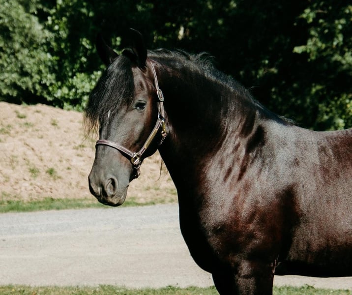 VERFÜGBAR AUF DEM ONLINE-PFERDEMARTKLOK AT www.MagicHorseAuction.com GEBOTEN BIS DIENSTAG, 17. Februar! – KAUF-OPTION „Buy It Now“ VERFÜGBAR! *Der endgültige Preis wird auf der Auktion festgelegt* VERKÄUFER-KONTAKT: Cindy Schie, Tel. 716-200-2937 STANDORT: Akron, NY Onyx, auch bekannt als Blackhawk, ist ein 6-jähriger, eingetragener Friesian/Pony-Geländefahrpferd, ca. 1,45 m groß. Er ist gut ausgebildet zum Reiten und Fahren. Er reitet sowohl im englischen als auch im western Stil. Ein fantastisches Arena-Pferd! Er läuft eine schöne Kreislinie, nimmt den Schritt, Trab und Galopp mühelos auf. Leg-yields gelingen problemlos. Er zeigt sich auf Hindernisparcours sehr zuverlässig. Er steht ruhig und geduldig an der Aufstiegshilfe, hält an und bleibt stehen, wenn man es verlangt. Er nimmt beide Führungen korrekt auf. Blackhawk wäre ein vielversprechendes Dressurpferd. Außerdem wurde Blackhawk auch auf dem Bauernhof eingesetzt. Er ist trail-erprobt, überquert Bäche, geht mühelos über Baumstämme und erklimmt alle Hügel, die man ihm vorsetzt. Er ist sowohl in der Gruppe als auch alleine verkehrssicher und bleibt geduldig an Stoppschildern stehen. Dieser hübsche Wallach hat zudem vorbildliche Bodenmanieren und eine äußerst freundliche Persönlichkeit. Er ist leicht zu fangen im Stall und draußen. Er lässt sich gut an der Longe anbinden und in Kreuzgurten sichern. Er ist einfach zu handhaben – sogar Kinder können ihn ohne Erwachsenenhilfe putzen, satteln und reitfertig machen. Er steht ruhig beim Hufschmied und Tierarzt. Blackhawk lässt sich gut verladen und bleibt während des Transports ruhig. Er hat eine super liebevolle Einstellung und liebt Aufmerksamkeit! Blackhawk ist 100 % gesund, mit Röntgenbildern und PPE! Für weitere Informationen kontaktieren Sie Cindy unter 716-200-2937! Standort: Akron, NY