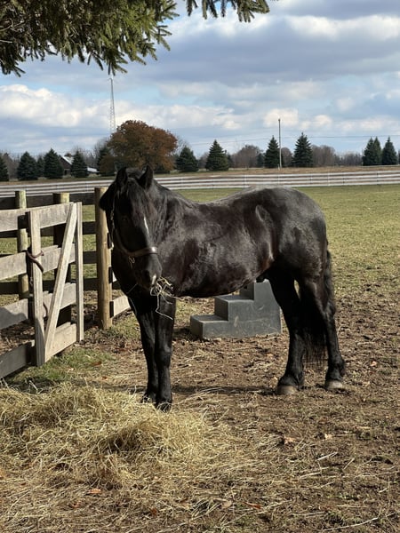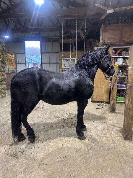 "AVAILABLE ON ONLINE HORSE AUCTION AT www DOT MagicHorseAuction DOT com BIDDING OPEN NOW thru TUESDAY |February 17th! - BUY IT NOW AVAILABLE! *Final price will be determined on auction site* CONSIGNOR CONTACT INFO: Cindy Schie #716-200-2937 LOCATION: Akron, NY" Onyx also known as Blackhawk is a 6-year-old registered Friesian/Pony gelding standing at 14.1hh. Well, broke to ride and drive. Rides both English and Western. Amazing arena horse! Lopes a circle nicely. Picks up walk, trot, and canter easily. Leg yields. Does great on obstacle courses.. Stands quietly and patiently at a mounting block. Stops and stands when asked. Picks up both leads correctly. Blackhawk would be a nice dressage prospect. Blackhawk has also been used on the farm. He has been on trails and will cross creeks, step over logs with ease, and climb any hill you ask him to. He does fine out in groups or out alone. He is traffic safe and will stand patiently while at stop signs. This pretty gelding also has excellent ground manners and has the sweetest personality. He is easy to catch in the stall and outside. Ties nicely on a lead line and in cross ties. He is easy to handle, even the kids can groom, tack, and get him ready to ride with no help from an adult. He stands well for the farrier and vet. Blackhawk loads well and remains quiet during hauling. He has a super sweet attitude and loves attention! Blackhawk sells a 100% sound with x-rays and PPE! Contact Cindy at 716-200-2937 for more information! Located in Akron,NY