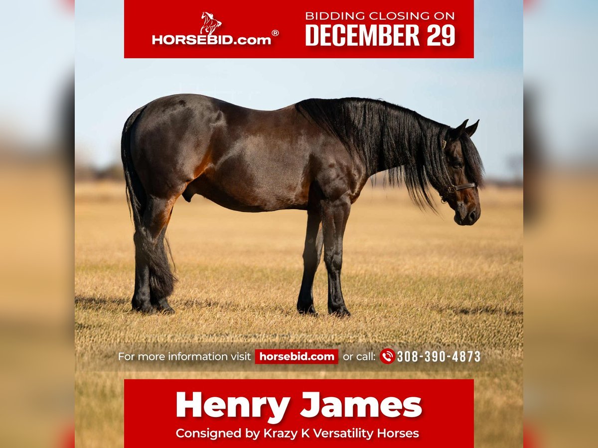 ⚜️ 𝓗𝓮𝓻𝓲𝓽𝓪𝓰𝓮 𝐖𝐢𝐧𝐭𝐞𝐫 𝓒𝓵𝓪𝓼𝓼𝓲𝓬⚜️ Happening now thru MONDAY | DECEMBER 29th - Available EXCLUSIVELY on HorseBid's website! For more details and to register visit: www.Horsebid.com CONSIGNOR CONTACT: Krazy K Versatility Horses 308-390-4873 LOCATION: Grand Island, NE BREED: Friesian cross REGISTERED: Yes REGISTERED NAME: Titus D Rocks COLOR: Black Bay HEIGHT: 15 AGE: 7 GENDER: Gelding Here ya go, folks! A horse that can do it all. He has not only been a barn favorite, but he has also been my very own personal favorite (and I am VERY PICKY). Allow me to tell you about this unicorn we call Henry James. Henry James is just the right height, standing a hair north of 15 hands. He is rich in color, black all over with chocolate accents. He has a mane and tail that most only dream about. Oh, and let me tell you about his personality. He is quiet and calm, a true steady Eddie. He will come when you call his name, usually at a trot! He has a funny, curious personality. But being respectful is at the top of his list. Henry James is easy to get along with, for both horses and people! He is also durable – or may I say wise enough to take care of himself. There is not one blemish on this beautiful boy, and he makes good decisions to keep it that way! Henry could live in a junk yard with a three ring circus next door and would still be injury free and quietly observing all the entertainment with an amused look on his face. Henry is kind and patient for the farrier. He is easy to shoe, but honestly, unless we are heading out into really rocky terrain, Henry James is perfectly fine barefoot. He has never taken a tender step and has proven himself to be as tough as a summer day is long. Henry is just a good-looking fellow. He seems to be able to stay in a world show condition on a round bale in a dry lot. He has lived in a box stall and has also spent months turned out with a herd of other horses. Either way, he is happy and content and easy to keep weight on. Wherever he is, he seems to be as neat as your granny at a Sunday brunch! Which is worth a lot at the end of a long day of cleaning stalls! All of these aspects are just the gravy on top, but let me tell you how he is to use and enjoy… Henry James rides both western and English or just climb aboard, bareback, in a halter if you need a therapeutic walk to bring you back to what matters most. We have taken him over down trees and cross rails a handful of times, which he jumps with grace and beauty! And ohhh, have you seen him pull a buggy? He is the easiest horse I have ever driven, and boy, does he look elegant - he can level up your Thanksgiving traditions or blow your Pinterest level wedding out of the water! No worries about traffic - we were asked to use him for a commercial on the down town streets, and he acted like the true gentleman he is. Henry James will ride one handed or two in just about any bit you like, but if you ask him what his very favorite is, he will tell you a smooth snaffle bit ridden two-handed. To add to this very long list of amazing things about Henry James, he is good with being ridden every day or just as great with time off - no worries, we have tried it and we know him well! Rather, it be a week off or 6 months off, he will pick up where you left at, if not be even better than what you remember. He is a quick study. I taught him to lay down in one day - he doesn't lay down as seamlessly as a camel on command, but I promise it is adorable how he grunts when he wallers down to his belly. Can you tell yet how much I truly love this horse? I really do. We are only listing him here because I want what is best for him - I want him to be someone's main man. My career revolves around showing Versatility Ranch Horse shows with the American Quarter Horse Association. While I know Henry is amazing, he doesn't fit in that box. I am just too immersed in the AQHA show industry for Henry James to have the spotlight that he deserves. So I am hoping his forever family finds him here. You will see it all in his video, so please take the time to watch it if his pictures and write-up speak to you. Henry James rides, drives, and does tricks. He is unfazed and very entertained by all obstacles - logs, water crossings, drags, ropes, cattle, tarps, hula hoops, and a big bouncy ball. He is all I have described and more. Please call if he sounds like the horse you have been searching for - he is truly a dream come true.