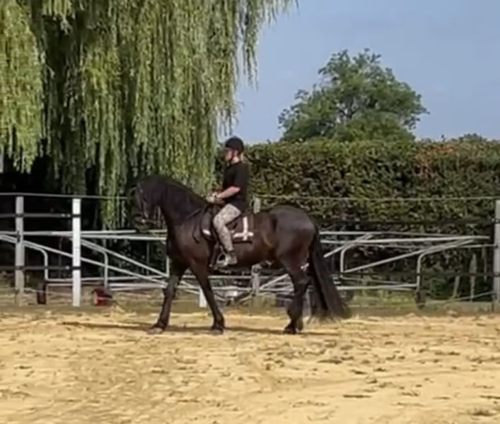 Montado y conducido (en silla sencilla y doble), un compañero muy agradable, también apto para principiantes, muy dulce. Tiene un lomo típico de tipo Frisón. Documentos de ascendencia y pasaporte de equino disponibles. Para más información, por favor llame al teléfono 0172-6785115. Por favor, no envíe consultas por escrito, los correos electrónicos no serán respondidos.