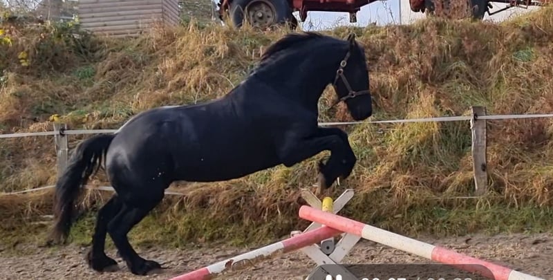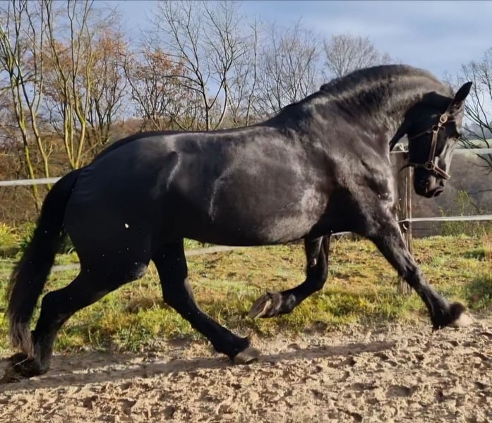 With a heavy heart, I must sadly part with my beloved partner in crime. He is a 9-year-old purebred Friesian gelding, standing at 173 cm. Frederico (affectionately called Freddy) is a reliable partner with whom you can do anything. He has excellent conformation and movement. No vices. He is familiar with children, farm life, dogs, and other animals. He knows both pasture and stable life (only overnight stays). He is herd-friendly and quickly makes new friends. He is a gentleman. Solo rides are always possible! Riding in a group is more fun, but riding alone is also good and relaxed. Freddy and I have participated in show jumping lessons, and he loves it! He has a few belongings he would like to bring to his new home. I wish him a truly wonderful home where he will be loved just as much as he was with me. Platz vor Preis.