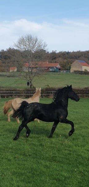 Handsome young Friesian stallion. Pedigree: Auwert 514 x Alwin 469 Date of Birth: June 16, 2023 Born here in France and raised in a free-range environment, the entire history of this beautiful stallion is well known. Well-built, healthy, and very people-oriented, he is exceptionally gentle. He has learned everything appropriate for his age. He has received all basic vaccinations. Deworming will be done in a timely manner. Good with the farrier. Holds the proper papers. If desired, he can be gelded and/or stay with us for the time being.