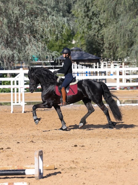 Tinus is a young Friesian stallion with an exceptionally striking appearance and a true baroque type that immediately captures attention. He is a stallion with substance, presence, and charisma, exactly what Friesian enthusiasts are looking for when they want a horse that stands out both in the stable and in the arena. He combines the classic Friesian look—deep black coat, strong frame, expressive head, and impressive mane—with a confident and masculine appearance. Tinus is a stallion that makes an impression without trying: bold, proud, and full of presence. Pedigree Jehannes x Ulbrân This pedigree brings together strong Friesian bloodlines, known for producing horses with power, expression, and a solid foundation. Tinus clearly reflects these qualities in his build and overall type, making him an interesting prospect for someone who appreciates a traditional Friesian with strength and character. Highlights - Young Friesian stallion - Very striking and eye-catching appearance - Strong baroque type - Powerful frame and correct conformation - Deep black color with expressive features - Masculine, proud presence - Ideal for lovers of the classic Friesian Tinus is a stallion for those who value authentic Friesian type — baroque, powerful, and impressive. Whether for future riding, breeding prospects, or simply owning a horse with undeniable presence, Tinus is a true head-turner. 📍 Available now 🔒 Serious enquiries only A rare opportunity to acquire a young Friesian stallion with real baroque strength and unmistakable presence.
