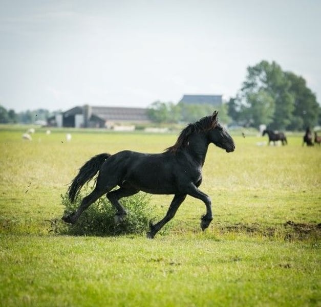 Meet Tjerk, a beautiful 3.5-year-old Frisian stallion who is expected to grow to approximately 1.55m. With his impressive, graceful movements, he seems to float through the arena. This handsome boy loves attention and we are sure that he will be enthusiastic to work with you. Tjerk is curious and eager to learn. Not only his movement and posture make him special; he is also strong and robust and he grew up with care and love in a natural herd on the vast pastures of Stud farm Vrijepaarden. Here he enjoys a healthy, free youth in harmony with his environment. If you wish, Tjerk can still be castrated here. At Stud farm Vrijepaarden we have a wide range of Frisian horses and Barock Pintos, all raised with love and passion. Our horses grow up in large herds, which contributes to their social, stable character. They are all green, chipped and have a passport. Feel free to come by to view our horses and find the horse of your dreams. We speak German, Dutch, Frisian and English, so don't hesitate to contact us for an appointment. Interested? Call or send a WhatsApp if you are seriously interested. We welcome you!