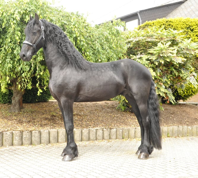 Ein sehr typvoller und korrekt gebauter Ster-Hengst mit überdurchschnittlichen Bewegungen und mega Ausstrahlung. Er hat einen sehr dicken und langen Behang und ist dem Alter entsprechend gut geritten und gefahren. Da er sehr rittig und gelehrig ist und immer gut mitarbeitet, läuft er auch schon den Außengalopp. Ein Pferd mit Potential für die höhere Dressur! Er hat einen mega Bergaufgalopp - ein Friese, der beim Reiten extrem Spaß macht! Er war übrigens im Hengstleistungstest. Er hat einen super Charakter und eine ganz tolle Arbeitseinstellung. Er macht einfach nur Spaß - egal ob im täglichen Umgang oder beim Reiten und Fahren. Ein ganz besonderes Pferd - ein absoluter Allrounder. Anfragen bitte ausschließlich telefonisch.