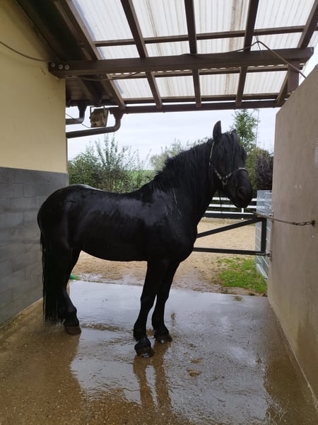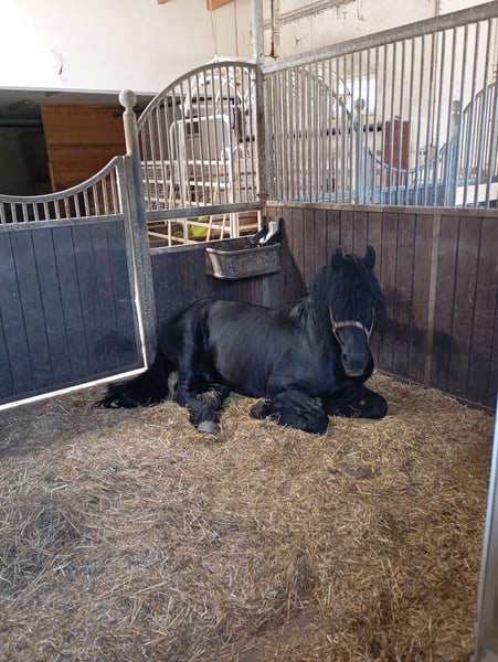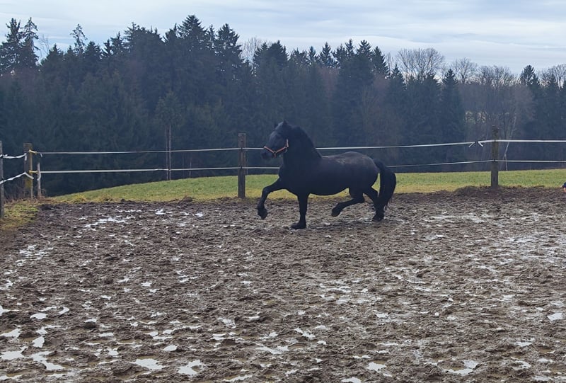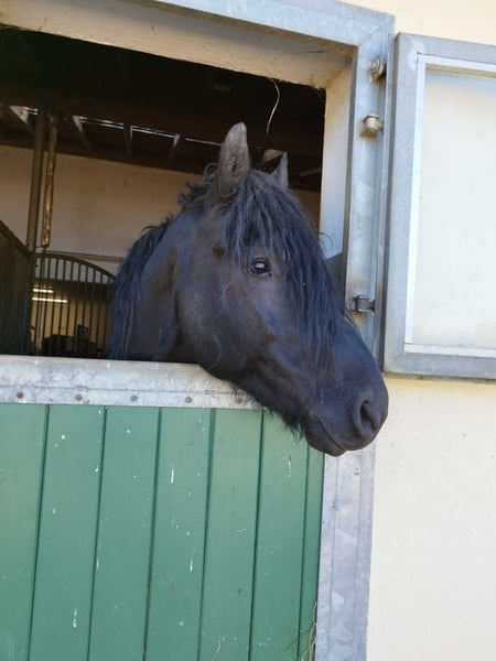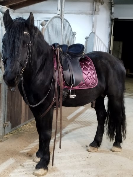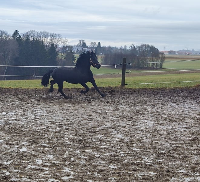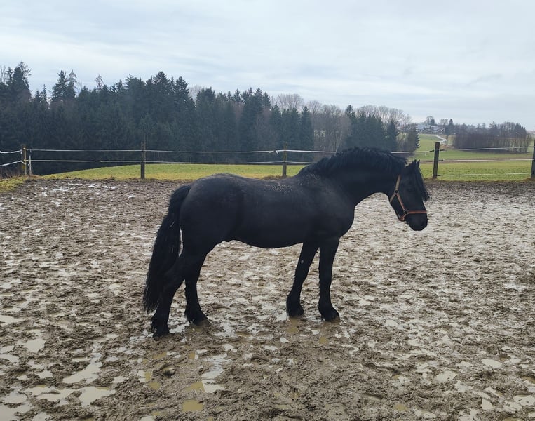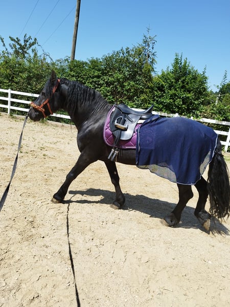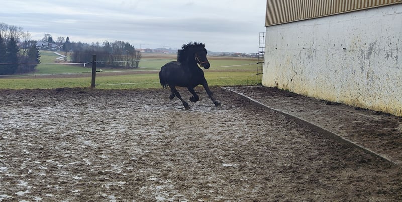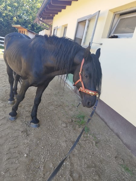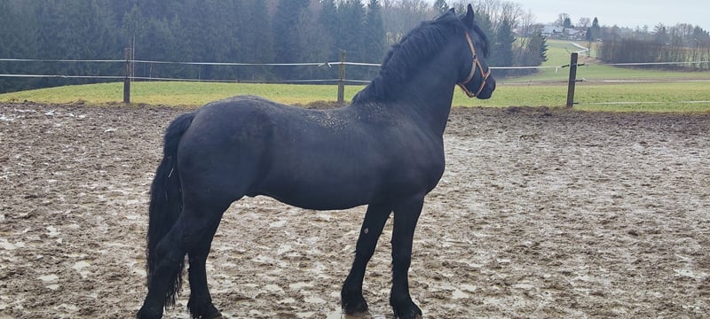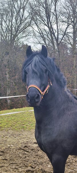 For sale is our 10-year-old Friesian-Fell Pony cross stallion, Alecandro, with an approximate height of 1.60 meters (16.1 hh). He is a striking black stallion, currently barefoot but also shod if needed. Alecandro is familiar with saddle, bridle, and rider’s weight. He has been ground-driven for leisure and has a solid foundation; however, he still requires calm, consistent training to build confidence and routine. He was backed some years ago, but his experience under harness is unknown. He is a spirited stallion: sensitive, attentive, and very present in handling. Therefore, he is only suitable for experienced horse owners, ideally with stallion handling experience. NOT suitable for beginners or children. Unfortunately, Alecandro has eczema (requiring appropriate management) and is also shod. Loading requires patience and time, and further training in this area is welcome. Location: 84550 Feichten an der Alz Price: €1,500 negotiable Note for interested parties: Alecandro will not be sold under time pressure. We are looking for a suitable home where he can settle in calmly and feel comfortable. If genuinely interested, please send a message with a brief introduction, your experience, and your stabling situation.