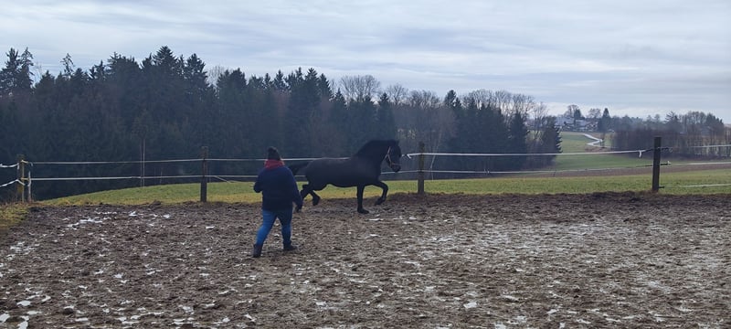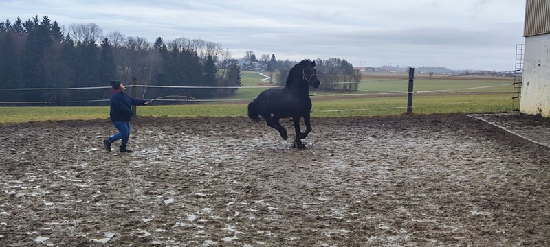 Zum Verkauf steht unser 10-jähriger Friesen-Fellpony-Mix Hengst Alecandro mit einem Stockmaß von ca. 1,60 m. Er ist ein ausdrucksstarker Rapphengst, aktuell geht er Barhuf kennt Eisen aber auch. Alecandro kennt Sattel, Trense und Reitergewicht. Er ist freizeitmäßig vom Boden gearbeitet und bringt eine solide Grundlage mit, benötigt aber weiterhin ruhige und konsequente Förderung, um Sicherheit und Routine zu entwickeln. Eingefahren wurde er vor Jahren auch aber es ist nicht bekannt wie er vor der Kutsche läuft. Er ist ein charakterstarker Hengst: sensibel, aufmerksam und sehr präsent im Umgang. Deshalb wird er ausschließlich in erfahrene Hände am besten mit Hengsterfahrung abgegeben. KEIN Anfänger oder Kinderpferd Leider ist Alecandro Ekzemer (entsprechendes Management nötig) und schmiedefromm. Verladen erfordert Zeit und Geduld, hier darf gerne weiter trainiert werden. Standort: 84550 Feichten an der Alz Preis: 1.500 € VB Hinweis für Interessenten: Alecandro wird nicht unter Zeitdruck vermittelt. Wir suchen ein passendes Zuhause, in dem er sich wohlfühlt und in Ruhe ankommen kann. Bei ernsthaftem Interesse freuen wir uns über eine Nachricht mit kurzer Vorstellung, Erfahrung und Haltungsform.