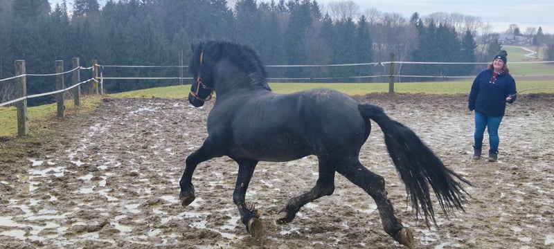 Se ofrece nuestro semental Alecandro, un cruce de Frisón y pony de pelo, de 10 años, con una altura de aproximadamente 1,60 m. Es un semental de color alazan con presencia destacada. Actualmente va descalzo, aunque también lleva herraduras. Alecandro conoce el uso de silla, brida y soporta el peso del jinete. Ha sido trabajado en libertad en ocio y cuenta con una base sólida; sin embargo, requiere una promoción tranquila y constante para desarrollar seguridad y rutina. Hace años que está montado, pero no se sabe cómo se comporta en carreta. Es un semental de carácter fuerte: sensible, atento y muy presente en el trato. Por ello, se busca entregarlo únicamente a manos experimentadas, preferiblemente con experiencia en sementales. NO es un caballo para principiantes o niños. Lamentablemente, Alecandro tiene eczema (requiere un manejo adecuado) y es cojo por la herradura. La carga en el remolque requiere tiempo y paciencia, y aquí se puede seguir entrenando. Ubicación: 84550 Feichten an der Alz Precio: 1.500 € VB Aviso para interesados: Alecandro no se vende bajo presión de tiempo. Buscamos un hogar adecuado donde pueda sentirse cómodo y llegar con calma. Si están seriamente interesados, agradeceríamos un mensaje con una breve presentación, experiencia y tipo de alojamiento.