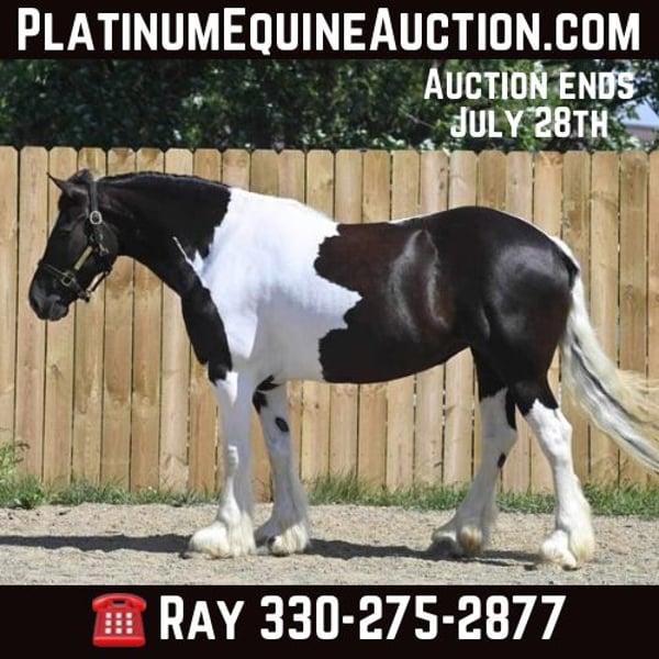 ONLINE AUCTION Place your bids at www.PlatinumEquineAuction.com Starting Bid $3500 Auction ends July 28th, 2024 Need a new saddle? Check out White Rock Saddles on our website or Facebook! Desty is a 9yr old, 15H, 1200lb, ¾Gypsy Vanner ¼Friesian mare. Desty is a well built, well broke, Gorgeous mare. She trail rides great, she loves the creek and is not bothered by the mud, brush, logs ect. She takes her time and crosses anything with ease. Desty is a pretty mover and has 3 nice gaits, she walks relaxed and calm. She jogs smoothly and has a very nice easy lope. We recently started jumping her and she really enjoys it! Desty is a beautiful well mannered mare, she is quiet in the barn and is easy to handle. Desty sells 100% sound with no vices. Please call or text Ray Raber 330-275-2877 FMI. ONLINE AUCTION Place your bids at www.PlatinumEquineAuction.com Starting Bid $3500 Auction ends July 28th, 2024 Need a new saddle? Check out White Rock Saddles on our website or Facebook!