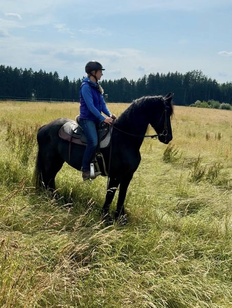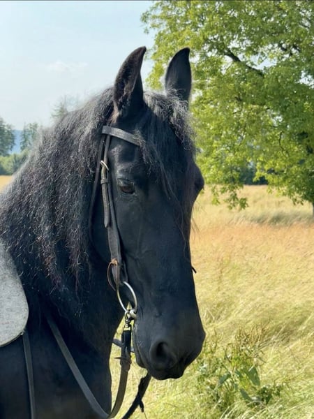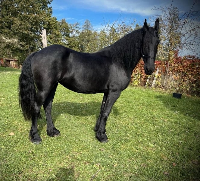 Friendly, attractive 16-year-old riding mare from a premium dam line, by Falbe348/Teunis332, born on April 26, 2009, for sale. All papers available. This elegant black mare impresses with her height of 158 cm and her classic, baroque build. She is also suitable for breeding, having already foaled two foals and proven to be a loving and caring mother. Emma from Lindenbaum is characterized by her friendly and open-minded nature. She is healthy, regularly vaccinated, dewormed, and has up-to-date dental care. She loads easily into a trailer, is well-behaved at the vet and farrier, and is familiar with trucks, tractors, and water. In the herd, she is absolutely sociable. Emma is accustomed to both box and open stall housing and is barefoot. If you are interested in this exceptional Friesian mare, I look forward to hearing from you.