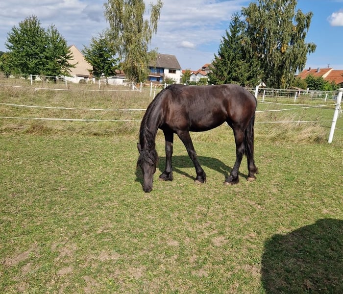 Aufgrund weiterer Nachzucht steht unsere 1,5jährige KFPS Friesenstute Arwen M. von Steinbach-Ries zum Verkauf. Vater ist der einzige im Deckdienst stehende Dries Sohn Martzen 521 Sport Elite AA, Mutter Sterstute von Tije 401 (Fabe Sohn). Arwen hat einen sehr hübschen Kopf, viel Behang ist sehr gut und solide gebaut, nicht zu leicht und nicht zu schwer, hat super Gänge, ist sehr anhänglich und verschmust. Was sie am meisten auszeichnet ist ihr absolut unaufgeregter Charakter und ihre Nervenstärke wie man sie nur noch ganz selten findet. Aufgrund dessen wird sie sicherlich auch gut zum Fahren, fürs Gelände und Shows etc geeignet sein und ein absolutes Verlasspferd werden. Gegenüber anderen Pferden ist sie freundlich aber durchsetzungsstark und wächst in der Gruppe mit ebenfalls jungen aber auch älteren Friesen auf. Hufe geben, Hufschmied, Putzen oder mit der Schwermaschine die Kinnhaare rasieren ist für Arwen alles kein Problem. Sie ist selbstverständlich regelmässig entwurmt und ist ein absolut gesundes junges Pferd welches noch nie irgendwelche Probleme hatte. Ihre Mutter sowie Halbschwestern können am Hof ebenfalls besichtigt werden. Als Fohlen erhielt Arwen auf der DFZ / KFPS Zuchtschau eine solide 2. Prämie. Aufgrund ihrer seltenen Abstammung sowie ihres guten Baus und Charakter sicherlich auch für die Zucht interessant. Ein Juwel für Leibhaber des wahren Friesenpferde-Charakters.