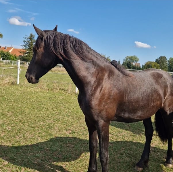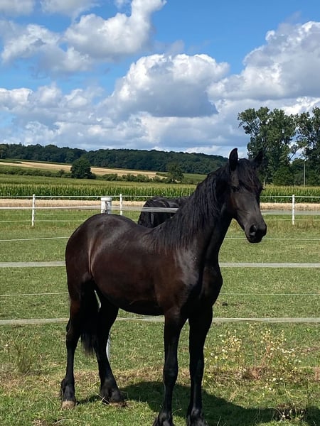 Due to further breeding, our 1.5-year-old KFPS Friesian mare Arwen M. by Steinbach-Ries is for sale. Her father is the only Dries son Martzen 521 Sport Elite AA currently in breeding service, and her mother is a Ster mare by Tije 401 (Fabe son). Arwen has a very pretty head, a lot of feathering, and is very well and solidly built, not too light and not too heavy. She has excellent gaits, is very affectionate, and loves to be petted. What stands out the most about her is her absolutely calm character and her nerve strength, which is very rare to find. Because of this, she will certainly be well-suited for driving, trail riding, shows, etc., and will become a reliable horse. She is friendly towards other horses but assertive and grows up in a group with both young and older Friesians. Picking up her hooves, farrier work, grooming, or shaving her chin hairs with a heavy machine is no problem for Arwen. She is, of course, regularly dewormed and is an absolutely healthy young horse that has never had any issues. Her mother and half-sisters can also be viewed at the farm. As a foal, Arwen received a solid 2nd premium at the DFZ/KFPS breeding show. Due to her rare lineage as well as her good build and character, she is certainly also interesting for breeding. A gem for lovers of the true Friesian horse character.