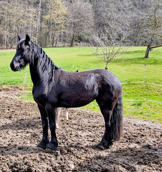 Traum in Schwarz: Elegante 4-jährige Friesenstute mit viel Potenzial Zum Verkauf steht diese bildschöne, 4-jährige Friesenstute, die nicht nur durch ihre klassische Optik, sondern auch durch ihren ehrlichen Charakter überzeugt. Eckdaten: Rasse: Friese Alter: 4 Jahre (Geboren: 30.03.2022) Geschlecht: Stute Stockmaß: ca. 160 cm Abstammung: Karon vom Goldfeld x Puschkin Papiere: sie ist eingetragen im FPZV, als Fohlen prämiert mit 1. Prämie Beschreibung: Diese junge Dame besticht durch ihr schwarzes Fell und die typisch schwungvollen Gänge. Sie zeigt sich im täglichen Umgang sehr menschenbezogen, neugierig, brav beim Putzen und schmiedefromm. Ausbildungsstand: Ihrem Alter entsprechend ist sie noch nicht geritten. Kennt Halfter und Bodenarbeit. Sie lernt extrem schnell, ist stets motiviert und möchte gefallen. Aufgrund ihres ausgeglichenen Temperaments ist sie ein ideales Nachwuchspferd. Regelmäßig entwurmt und geimpft und die Zähne kontrolliert. Sie ist bei uns im Offenstall im Herdenverband aufgewachsen. Wir suchen für sie ein 5-Sterne-Zuhause, in dem sie weiter gefördert wird. Preis: 12.900,00 € Bei ernsthaftem Interesse freue ich mich über eine Nachricht, um einen Termin zum Kennenlernen zu vereinbaren.