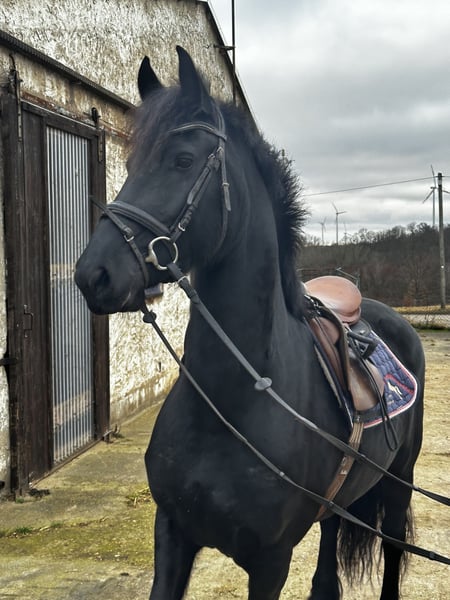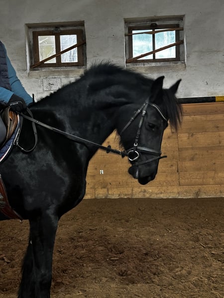 Verkaufe elegante Friesen-Stute – Geburtsjahr 2021 Zum Verkauf steht eine wunderschöne Friesen-Stute, geboren im Jahr 2021. Mit einem Stockmaß von ca. 165 cm vereint sie beeindruckende Größe und edlen Ausdruck. Die Stute ist zweispännig im Fahren einsetzbar und zeigt sich hierbei im Umgang äußerst angenehm und lernwillig, aufgrund ihres Alters benötigt sie in manchen Situationen noch einen sicheren Partner. Ideal für Reiter, die ein unverbrauchtes und charakterstarkes Pferd suchen. Sie befindet sich in professionellem Beritt und ist bereit für die nächsten Abenteuer. Nicht für Anfänger geeignet. Bei Interesse stehe ich gerne für weitere Informationen unter 01774392222 zur Verfügung. Ein Probereiten ist jederzeit möglich.