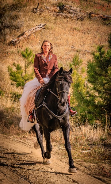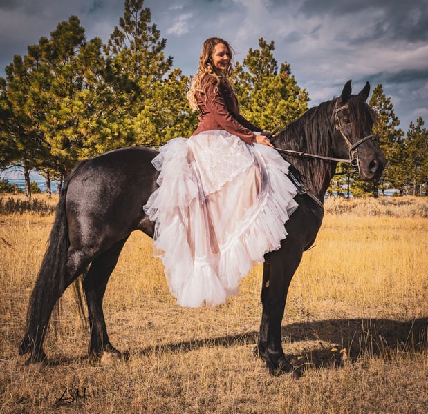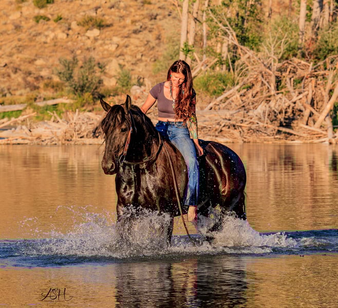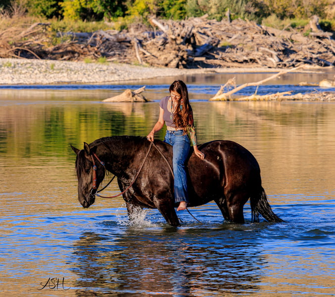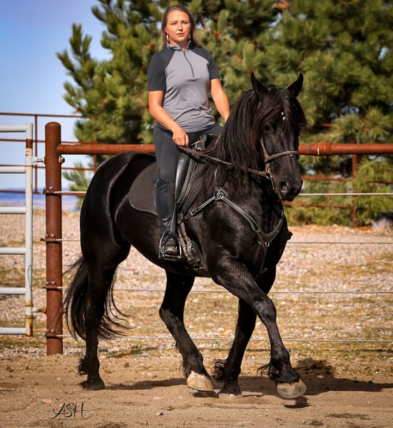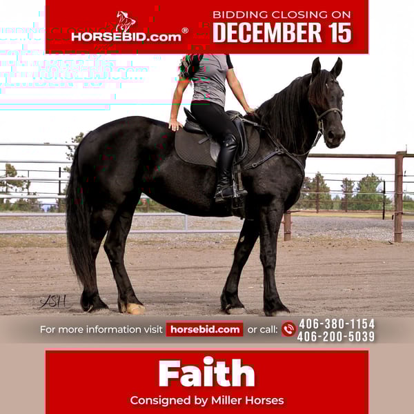 🎄𝐓𝐇𝐄 𝑯𝒐𝒍𝒊𝒅𝒂𝒚 𝐂𝐋𝐀𝐒𝐒𝐈𝐂🎄 Happening now thru MONDAY | DECEMBER 15th - Available EXCLUSIVELY on HorseBid's website! For more details and to register visit: www.Horsebid.com CONSIGNOR CONTACT: Miller Horses 406-380-1154 406-200-5039 LOCATION: Billings, MT BREED: Friesian Sport Horse Registry REGISTERED: Yes REGISTERED NAME: Sky View's Faith COLOR: Black HEIGHT: 15.3 AGE: 5 GENDER: Mare SKY VIEWS FAITH – 2020 FSHR Black Mare BY - Tetrino Van Het Kasteel x Jasper 366 Out of - R.A.M.’s Polly x Percheron Bred and raised right here at Miller Family Horses in Moore, Montana. She’s half Friesian, half Percheron—a good mix of elegance and strength. Faith is as gentle as they come, always first to the gate with a calm, steady way about her. She’s been around cattle, crossed water, and handled busy days without batting an eye. She drives well in single hitch, with plenty of experience from wagon rides and ranch chores. Under saddle, she’s lovely and coming along nicely, responsive to leg cues, picking up leads, and moving smooth through her walk, trot, and canter. She’s been used at the stockyards and has experience around cattle. On the ground, she’s easy to handle—good for the farrier, takes a bath no problem, and stands quiet for the mounting block. She’s an easy keeper, too. Faith is a solid mare, good-looking and reliable, a true product of our breeding program. She would make a great family, trail, dressage, or a super fancy ranch horse. FMI: Call 406-380-1154(can NOT receive text) send Text messages to 406-200-5039