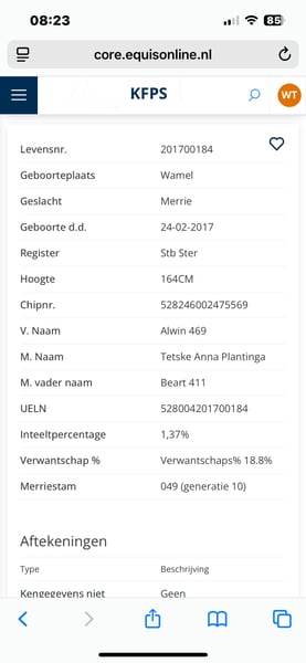 Wunderschöne, elegante Stute mit Fohlenhengst von Tijmen. Schlank gebaut, mit kräftigem Schweif und Mähne. Dunkles, glänzendes Fell, edles Kopfprofil. Hat bereits vier Fohlen bekommen, die Geburt gelingt ihr mühelos ohne Hilfe. Inzuchtkoeffizient 1,37, Verwandtschaftsgrad 18,8, Stutenlinie 049. Wird schweren Herzens abgegeben aufgrund der Beendigung der Zucht. Sie ist eingeritten, steht aber seit einiger Zeit still, da sie ein Fohlen am Fuß hat.