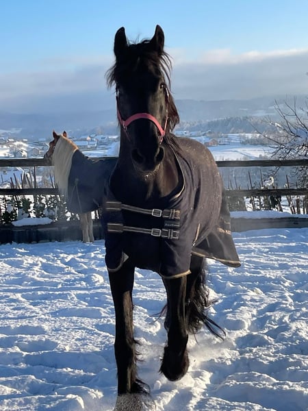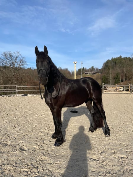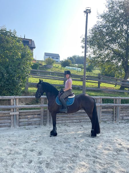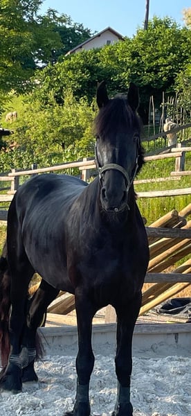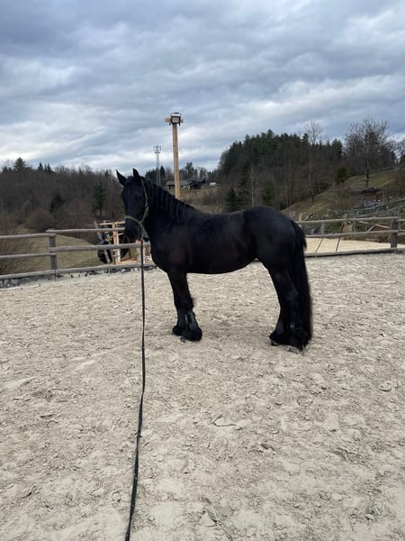 8-year-old Friesian Mare for Sale A very well-behaved Friesian mare is for sale. She is ridden at a basic dressage level and, with some additional work, would be suitable for dressage competitions. She is very calm and reliable on trail rides and is also suitable for children. She loads well onto a trailer and has no issues with showering, farrier work, or daily care. She is an extremely friendly and sociable horse. She has sweet itch (summer eczema), which is well managed with proper care. For sale only to a good home. The reason for sale is moving abroad.