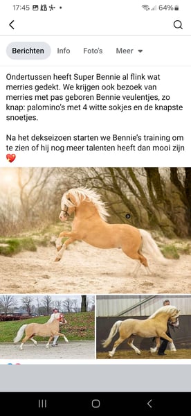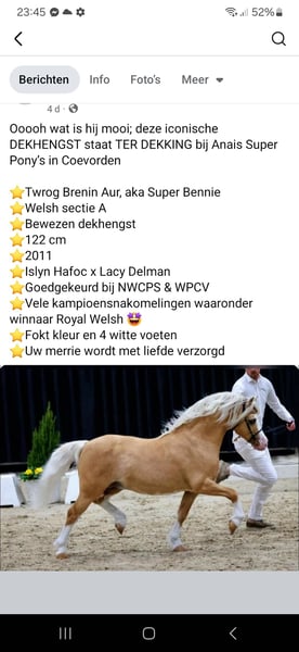 Super knappe Welsh ster merrie te koop! Met een prachtige afstamming. Heniarth Question x Beymark Stephen. Perfect om mee te fokken, dit hebben wij dus ook gedaan, ze is drachtig van de bewezen hengst; Twrog Brenin Aur; Islyn Hafoc x Lacy Delman. (Zie foto's) 16april is ze uitgerekend. Ze kan ook uitmuntend draven! Heerlijk showen, in de ring. Een echte showpony, dit heeft ze ook wel al bewezen, bij verschillende keuringen. We hebben er hier 3keer opgezeten, dit zou door een ervaren ruitertje opgepakt kunnen worden, maar ze is wat onzeker tijdens rijden. Wat haar niet geschikt maakt voor een onervaren ruitertje vinden wij zelf. Vandaar dat ik haar als fokmerrie verkoop. Eigenlijk kunnen we niet wachten totdag het veulen er is, maar we zijn tegen een bixie pony aangelopen voor onze dochter, en aangezien we niet alles kunnen houden, kijken we toch of we een passend huis kunnen vinden voor Catlyn. Voor vragen bel even naar: 0638365498.