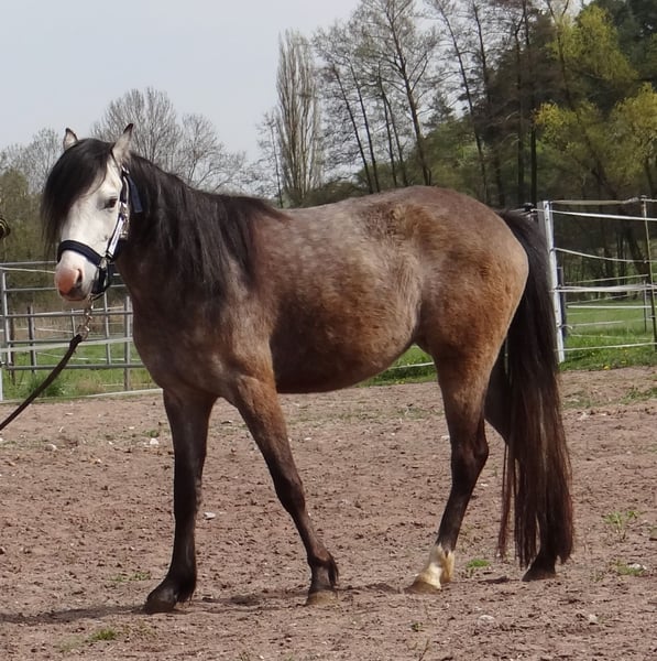Princess, registered in her passport as Braunisabell, can develop into a grey. She impresses with three very good gaits that, with proper training, will improve even further. Despite her young age, she is already very human-oriented and affectionate. She demonstrates great joy in jumping and exhibits an excellent canter, capable of competing with Thoroughbreds. Due to her pedigree, she is also highly suitable for breeding. Her sire, Turnina’s Rosco, an exceptional stallion for sport pony breeding, was the outstanding champion stallion in the sport pony division at his licensing in Munich in 2018 and, like his sire, was awarded the South German Premium. He impressively passed his four-year-old field test with the highest score of 10 for his driving aptitude (overall score 9.39). The full brother of her dam has achieved success in dressage competitions at the M level. The dam line consistently produces superior sport ponies with substance and conformation. Her dam, Moorkieker Letkiss, was the regional champion of English ponies in 2017 and successfully completed her mare performance test in 2018 with a jumping score of 8.5 and a weighted final score of 7.88 in the open pony class, earning her second place. Regardless of her sporting talent, she is a perfect children's pony. Princess is a jewel in terms of willingness to perform and character. Due to her age, she will only be placed in experienced hands.