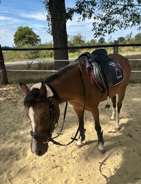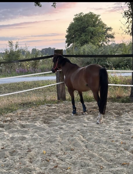 Bambi ist 5 Jahre alt, ca. 1,30 m und auf einem landwirtschaftlichen Hof zuhause – Traktoren, Kühe und allgemeinen Hoftrubel kennt sie problemlos. Sie ist in allen drei Grundgangarten geritten, bei den Vorbesitzern auch Kutsche gefahren (von mir nicht genutzt). Im Umgang ist Bambi ein liebes und unkompliziertes Pony. Zwei 12-jährige Mädchen reiten sie hier regelmäßig. beim Führen mit Kleinkindern ist sie ebenfalls sehr lieb und vorsichtig. An manchen Tagen kommt aber mal der typische Ponykopf durch und sie freut sich dann über jemanden, der sich freundlich, aber klar durchsetzen kann. Daher ideal für Kinder mit Reiterfahrung, aber keine kompletten Anfänger. Bambi hat sehr schöne, elastische Gänge, und ich bin mir sicher, dass sie mit weiterer, kontinuierlicher Arbeit ein richtig tolles Turnierpony werden kann. Das Potenzial bringt sie definitiv mit. Außerdem ist sie unkompliziert im Alltag – sie hat kein Problem damit, auch mal ein paar Stunden alleine auf der Wiese oder im Stall zu stehen. Sie ist gesund, regelmäßig entwurmt und bringt viel Potenzial mit. Gerne auch telefonisch melden 01758616588