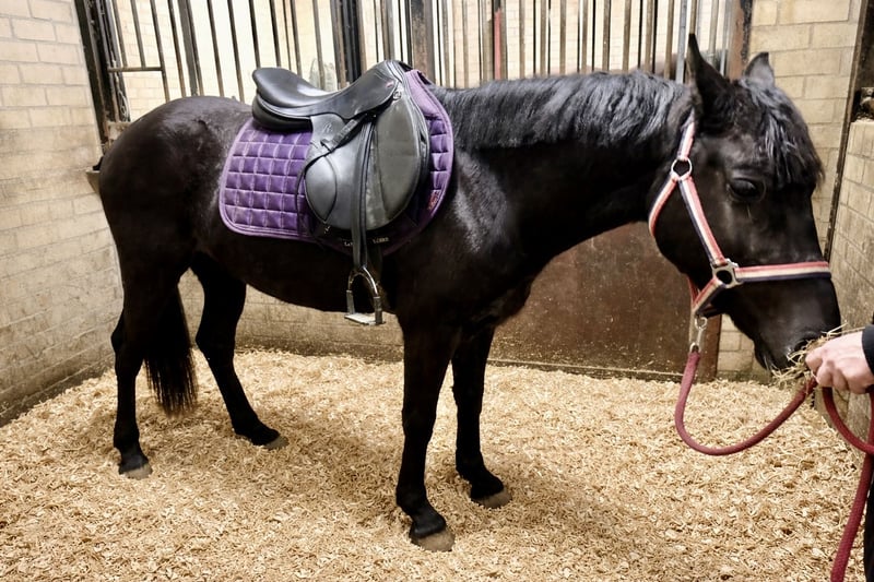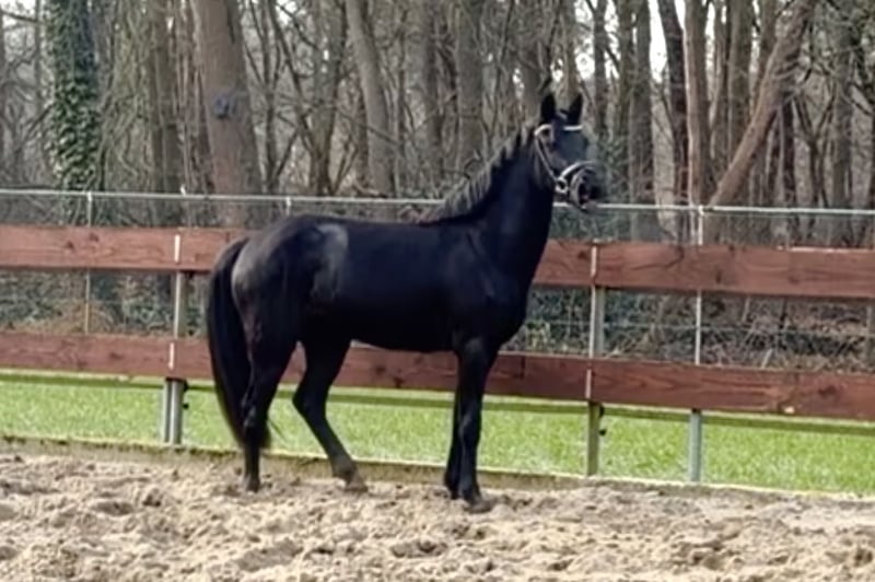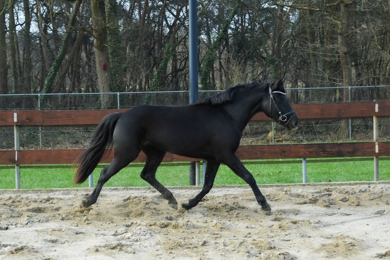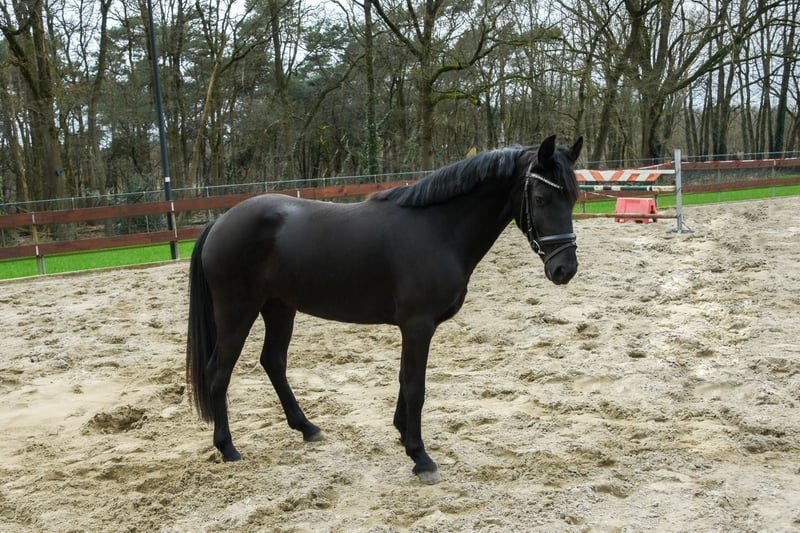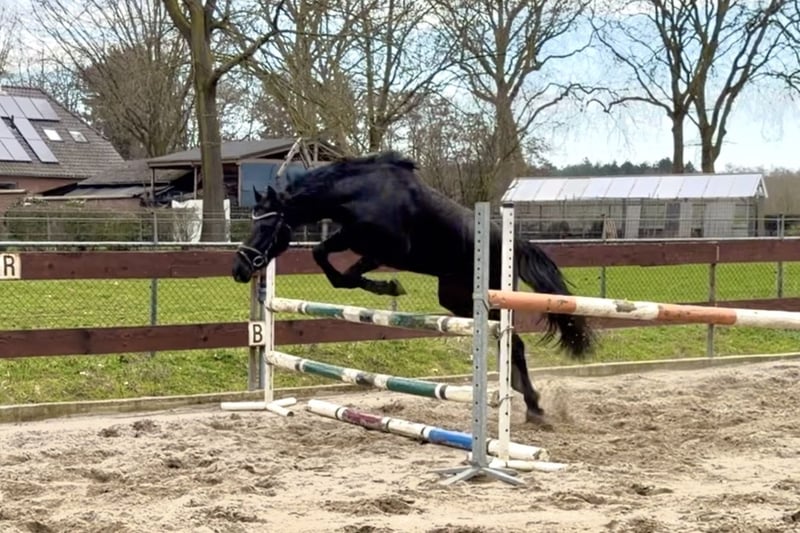 Soraya is een ontzettend lieve en aanhankelijke 3 jarige zwarte D-pony merrie. Ze meet 1.44m en zal naar verwachting uitgroeien tot een mooie grote D-pony rond de 1.46m. De afstamming is helaas onbekend. Er zit wel een Nederlands paspoort bij die netjes als veulen is aangevraagd. We denken zelf dat er iets van New Forest in zit. Soraya heeft ontzettend goede gangen! Op de foto’s en filmpje lieten we haar voor de eerste keer los springen. Ze deed dit heel goed en heeft zeker potentie voor hoger maar gezien haar jonge leeftijd zijn we nog niet hoger gegaan! Ondanks haar jonge leeftijd is het echt een brave pony en super aanhankelijk! Ze komt meteen naar je toe en houdt er ook van om vertroeteld en geknuffeld te worden. Ze is makkelijk in de omgang, is rustig op stal, staat netjes stil tijdens het poetsen, kent het halster op en af doen, een dekentje en loopt dus ook braaf mee aan een touwtje. Ze komt meteen naar je toe in de wei en is ook heel sociaal naar andere paarden. We hebben nu 1 keer een zadel met singeltje op gedaan in de stal om te kijken hoe ze hier op reageert en ze blikte of bloosde niet, ze gaf er niks om, echt een hele brave pony! We verwachten dan ook dat ze snel en makkelijk zadelmak zal zijn. Ze heeft geen (stal)gebreken! Ze is trailermak en kent ook het vrachtwagentje. Ze is nog onbeleerd. Leuke kans voor iemand die een toekomstige sport- en kinderpony zoekt om zelf te beleren. Vaste prijs € 3450