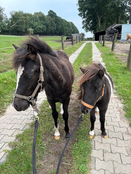 Ik ben Mogli, geboren op 7 mei 2025, en ik zoek een nieuw thuis. Ik ben een zeer nieuwsgierig en dapper kereltje. Trailer rijden, aan de longe staan, poetsen, overal aangeraakt en geleid worden – dat is voor mij geen enkel probleem. Ik ben echt een super coole knul. Mijn moeder is een compacte ponyruin van ongeveer 1,25 m, en mijn vader is ongeveer 10 cm groter (zie laatste foto). Omdat ik nu al zulke lange benen heb, denken alle anderen dat ik makkelijk de grootte van mijn vader zal bereiken. Momenteel woon ik samen met twee andere jongens in een open stal, dat gaat prima. Wil je meer over mij weten? Neem gerust contact met me op. Mijn beste vriend Odin is geboren op 19 mei 2024 en zoekt ook een nieuw thuis. Odin is voor zijn leeftijd absoluut braaf en lief. Hij kent kinderen en alles wat daarbij hoort. Hij vertoont geen hengstengedrag en wandelt netjes mee in het terrein. Zijn ouders zijn 90 cm en 1,10 m groot. Deze maat zal hij ook krijgen. Ik denk dat hij een geweldig kinderpony of koetspony kan worden. Voor meer informatie, neem gerust contact op.