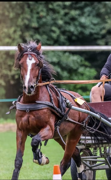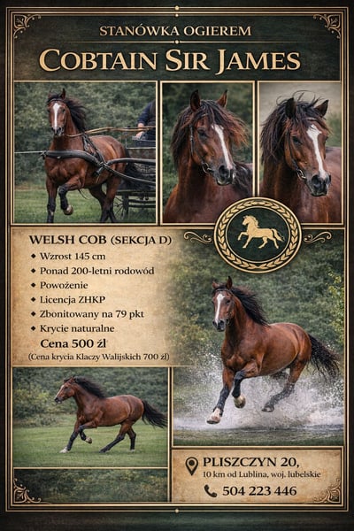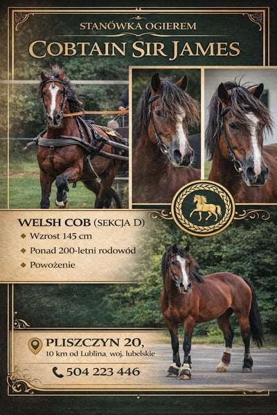 Cobtain Sir James Rasa: Welsh Cob (Sekcja D) Wzrost: 145 cm Oferujemy stanówkę sprawdzonym ogierem hodowlanym Cobtain Sir James, wywodzącym się z linii hodowlanej o ponad 200-letniej historii. Rodowód typowy dla rasy Welsh Cob – nastawiony na użytkowość, wytrzymałość, poprawny ruch oraz stabilny charakter. Charakterystyka hodowlana: • bardzo dobry, zrównoważony temperament („dobra głowa”), • spokojny, chętny do pracy, łatwy w obsłudze, • poprawna budowa i wyraźny typ rasy, • predyspozycje zaprzęgowe. Użytkowość: Ogier aktywnie uczestniczy w zawodach powożenia, co potwierdza jego wartość użytkową, odporność psychiczną oraz zdolności ruchowe. Może przekazywać potomstwu cechy pożądane zarówno w hodowli sportowej, jak i rekreacyjno-użytkowej. Przeznaczenie hodowlane: Polecany do klaczy w celu poprawy: • temperamentu, • użytkowości zaprzęgowej, • ruchu i charakteru potomstwa, • zachowania klasycznego typu Welsh Cob. 📍 Miejsce stanówki: Pliszczyn 20, ok. 10 km od Lublina, woj. lubelskie 📞 Kontakt: 504 223 446