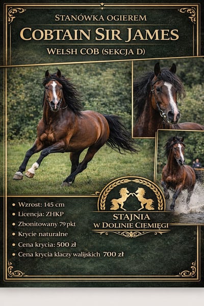 Cobtain Sir James Rasse: Welsh Cob (Sektion D) Größe: 145 cm Wir bieten die Deckstation mit dem bewährten Zuchtwallach Cobtain Sir James an, der aus einer Zuchtlinie mit über 200 Jahren Geschichte stammt. Sein Pedigree entspricht dem typischen Welsh Cob – fokussiert auf Nutzbarkeit, Robustheit, korrekten Bewegungen und ausgeglichenem Temperament. Zuchtmerkmale: - Sehr guter, ausgeglichener Charakter („Guter Kopf“) - Ruhig, arbeitswillig, leicht zu handhaben - Korrekter Körperbau und ausgeprägter Rassetyp - Eignung für Kutschfahrten Nutzbarkeit: Der Wallach ist aktiv im Kutschenfahren im Turniersport tätig, was seine Gebrauchswerte, psychische Widerstandskraft und Bewegungsfähigkeit unter Beweis stellt. Er kann Nachkommen mit wünschenswerten Eigenschaften sowohl für den Leistungssport als auch für die Freizeitreiterei weitergeben. Zuchtzweck: Empfohlen für Stuten zur Verbesserung von: - Temperament - Kutschfähigkeit - Bewegungsqualität und Charakter der Nachkommen - Erhaltung des klassischen Welsh Cob-Typs 📍 Zuchtstätte: Pliszczyn 20, ca. 10 km von Lublin entfernt, Woiwodschaft Lublin 📞 Kontakt: 504 223 446