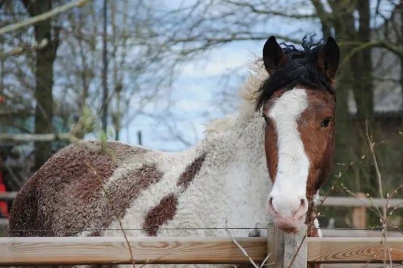 Yegua castaña con manchas tobiano, cruce Curly x Welsh Cob, de 1,60 m de altura.